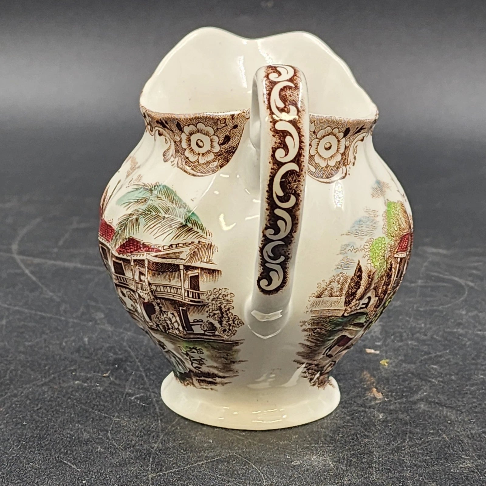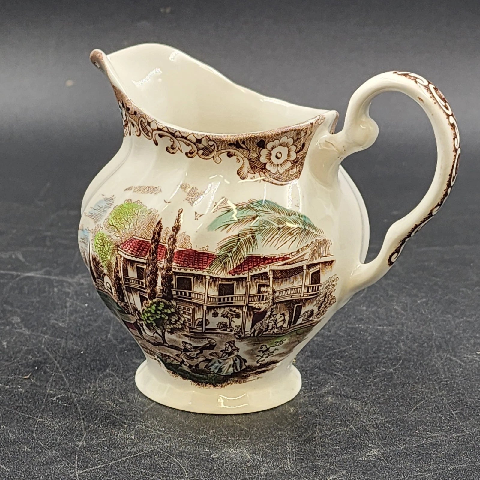 This is a vintage Johnson Bros Heritage Hall Creamer, a discontinued piece of Staffordshire Ironstone made in England. The brown multicolor pattern, also known as Spanish Hacienda (Pattern 4411), features a detailed American transferware scene of a colonial house. Crafted from durable ironstone, this creamer is a charming addition to any vintage dinnerware collection.