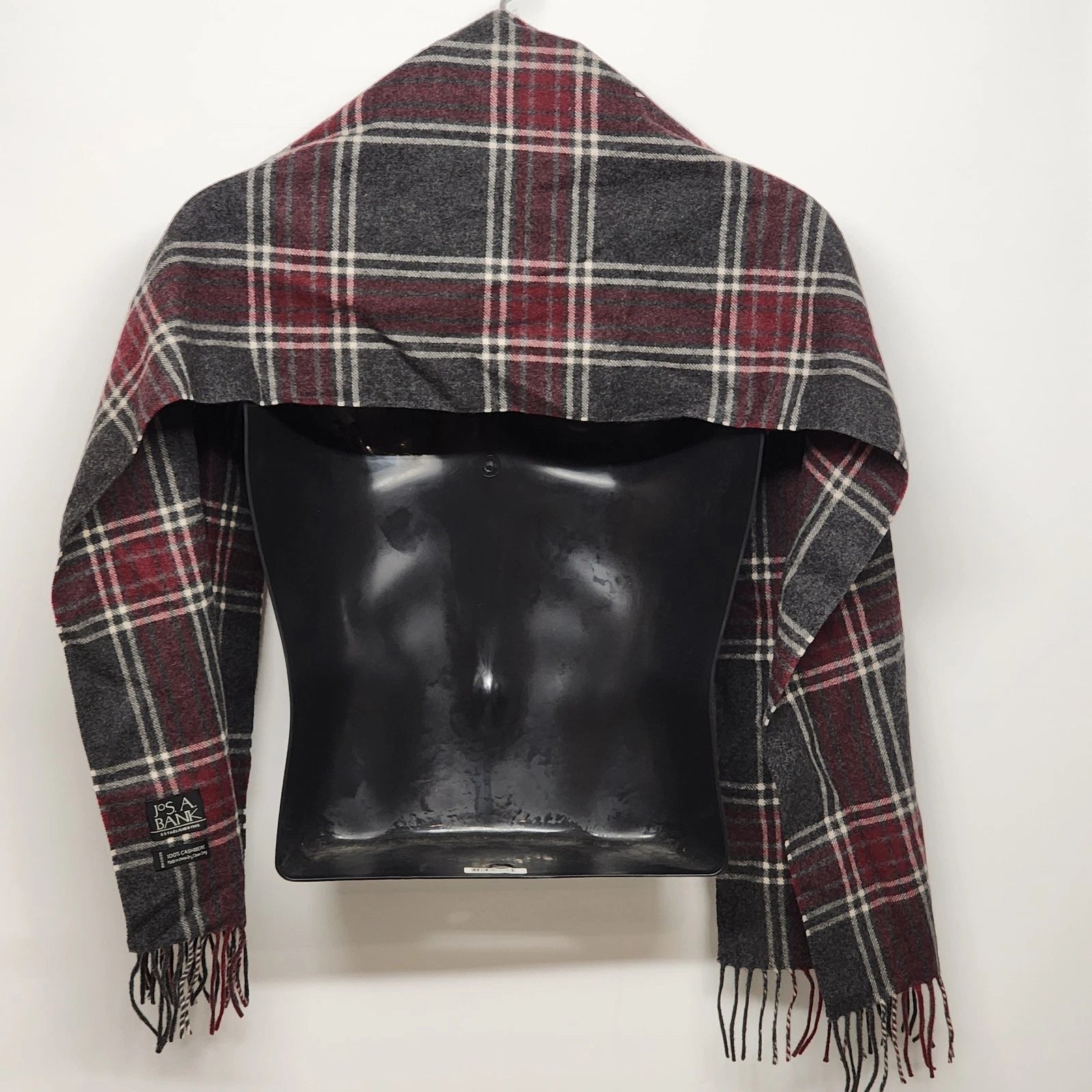 Jos A Bank 100% Cashmere Scarf Burgundy Gray Plaid Check Fringed Oblong 60"x12"