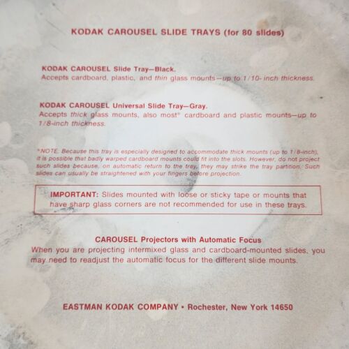 This Kodak Carousel Rotary 80 Slide Tray is the perfect accessory for your slide projector. Made for Kodak projectors and compatible with 35mm slides of all types, this tray has a tray capacity of 80 slides. Its stackable design makes it easy to store and organize your slides. The unit is made in the United States and comes in its original vintage box. It is a must-have for film photography enthusiasts and collectors alike.