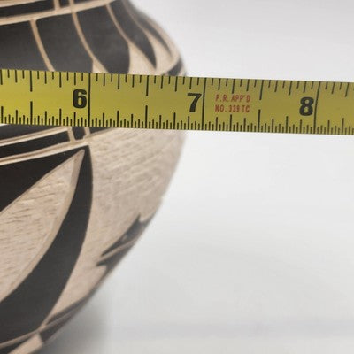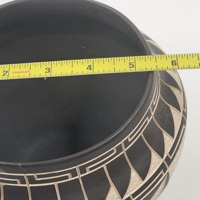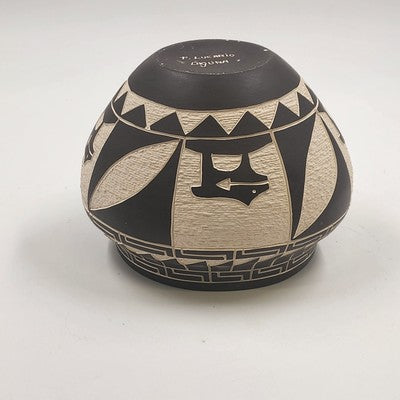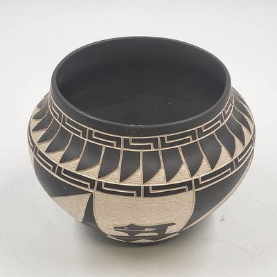 This stunning piece exemplifies the artistry and tradition of Laguna Pueblo pottery. Featuring a heartline deer motif and intricate black-and-white geometric patterns, this pottery bowl is a striking representation of Southwestern Native American craftsmanship.