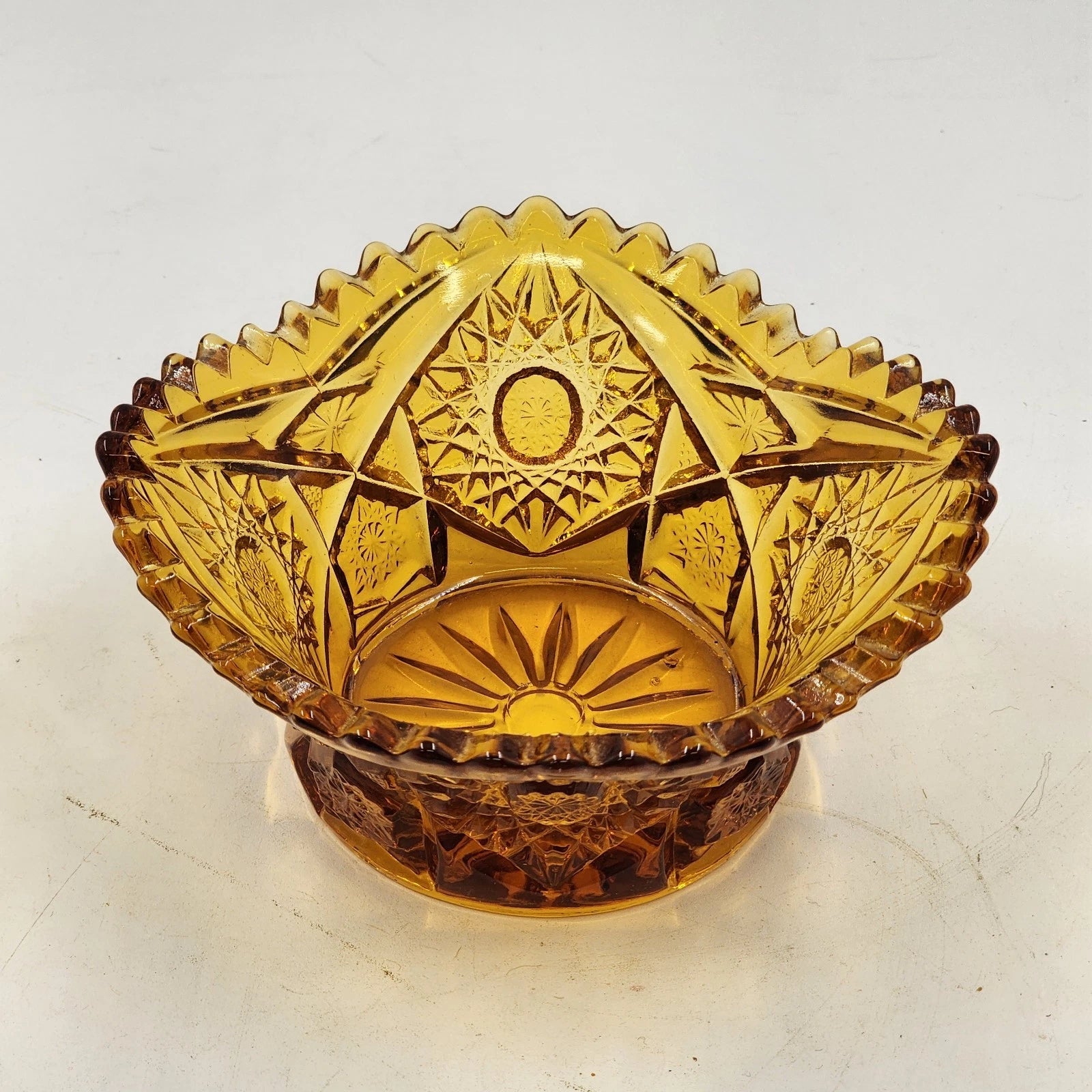 LE Smith Amber Glass Candy Nut Dish 6" Starburst Pattern Sawtooth Rim