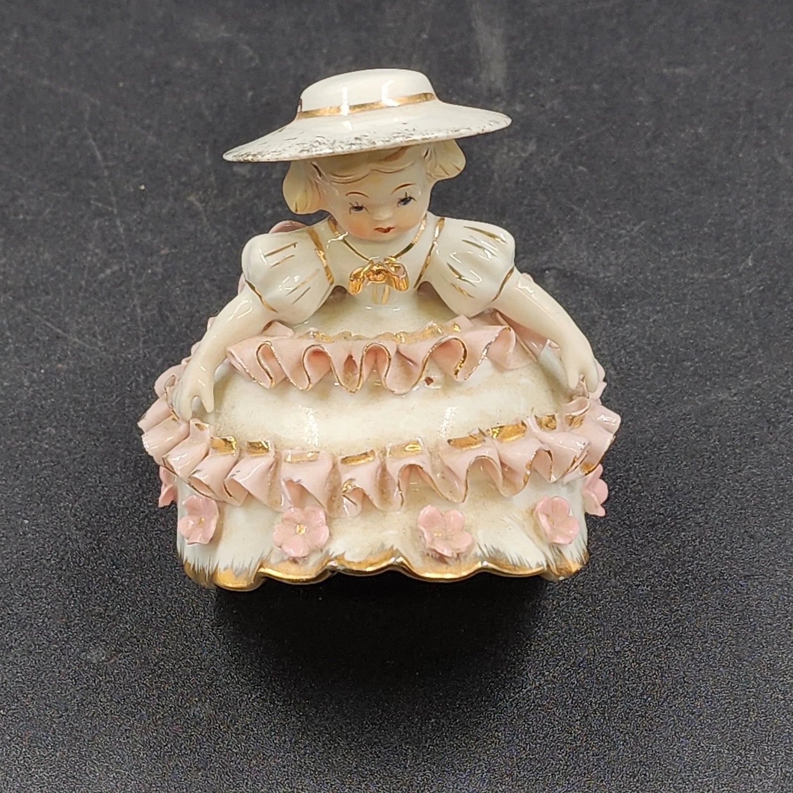 Add a nostalgic charm to your collection with this vintage "Bloomer Girl" figurine from Geo. Z. Lefton, likely produced in the 1950s. This lovely porcelain piece features a young girl in a wide-brimmed hat and pink ruffled dress with gold trim, capturing the sweet and delicate style of mid-century collectibles. Though it shows minor chips on the dress frill and ribbon, it still displays beautifully and retains its vintage appeal.