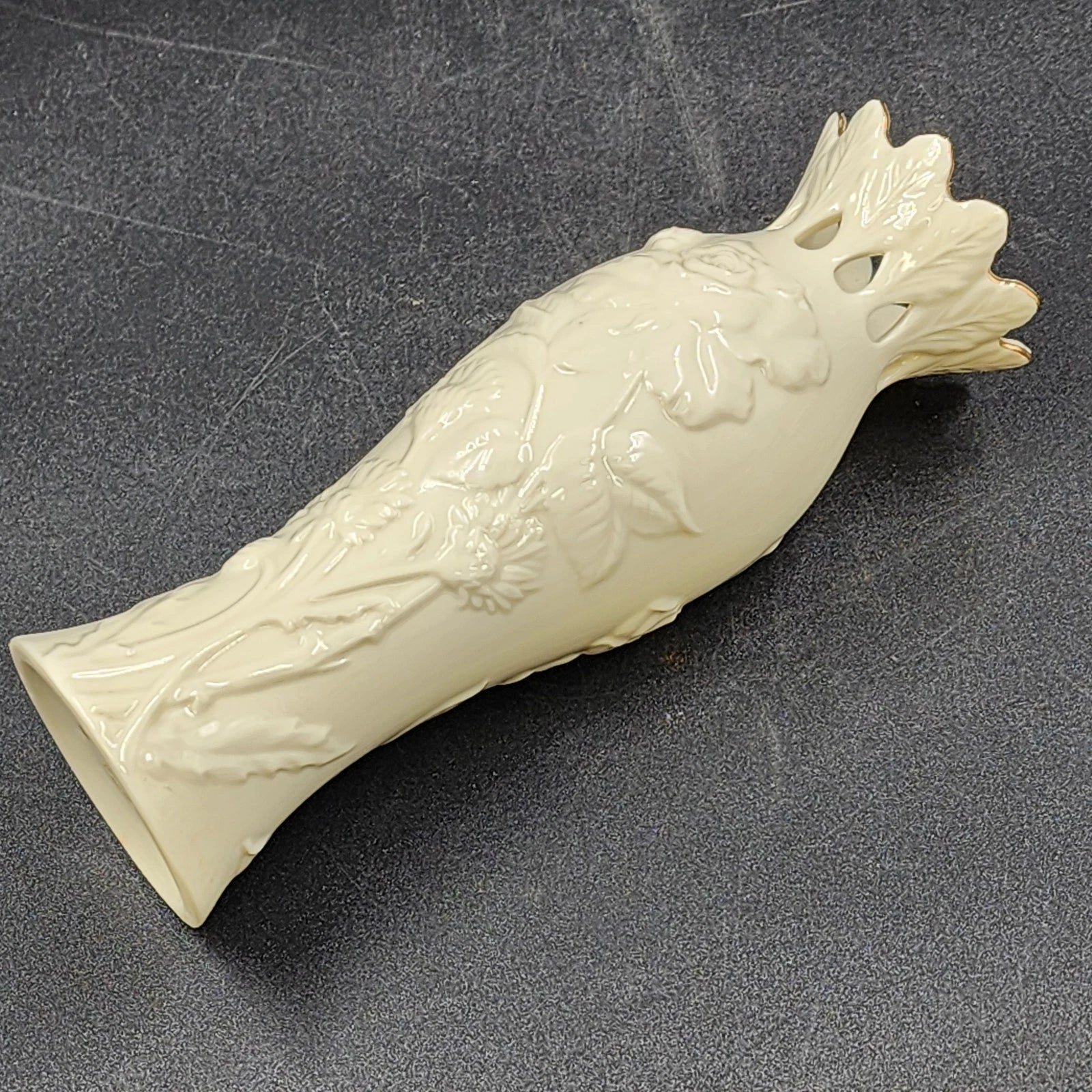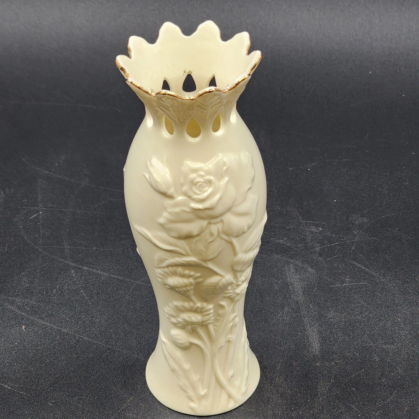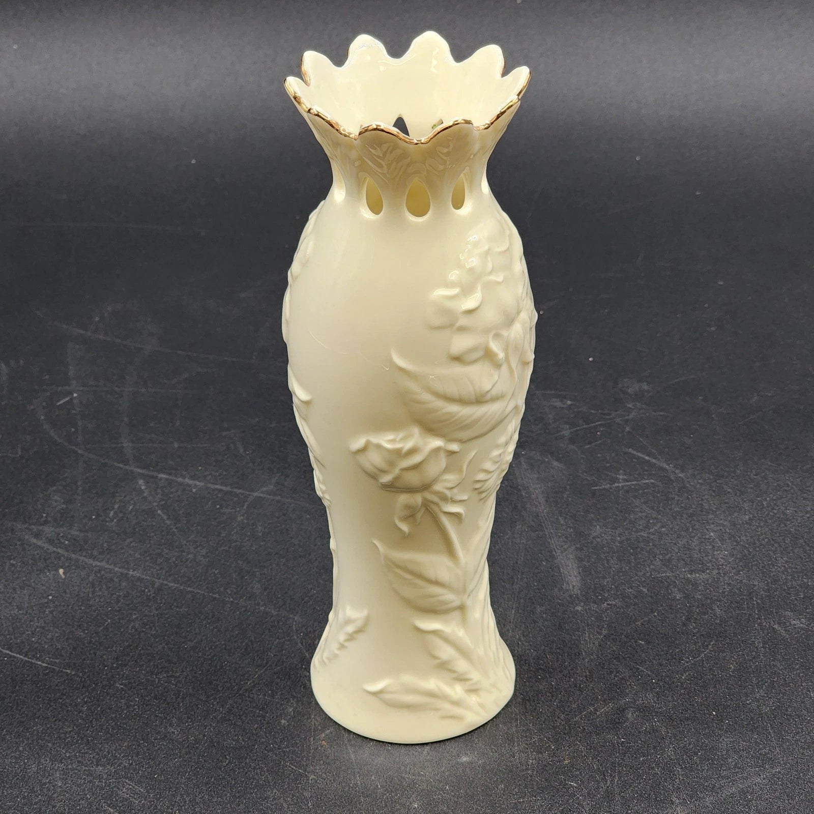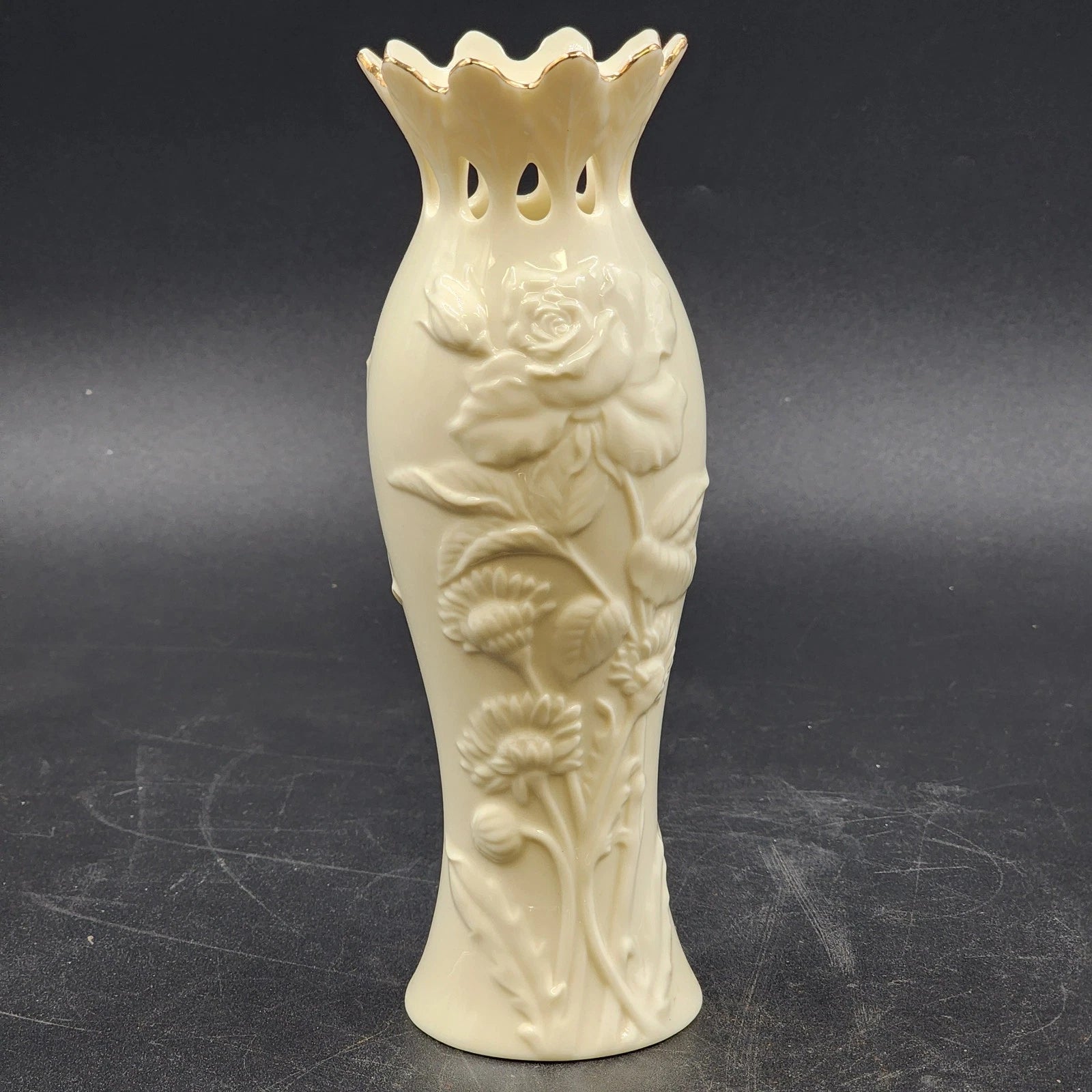 This beautiful Lenox "Gift of Knowledge" bud vase is a limited edition piece created to support Breast Cancer Awareness. Crafted from exquisite Lenox fine china, the 8-inch vase features a bas-relief tea rose motif, a pierced rim, and elegant gold trim. It is a graceful and meaningful addition to any collection and is in very good condition.