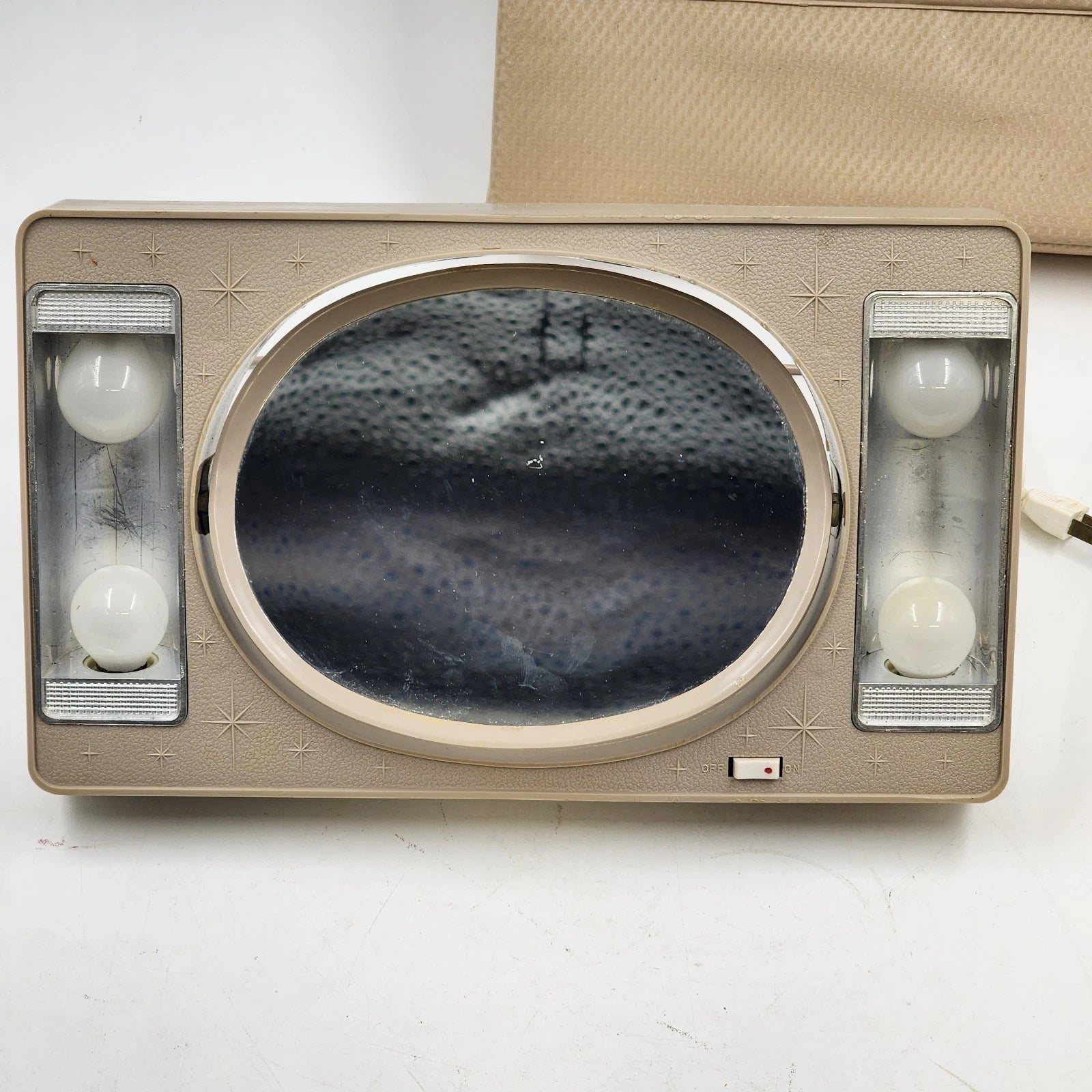 Add vintage charm to your vanity with this vintage lighted magnifying makeup mirror, featuring classic 1960s starburst glam style. With dual lighting and a swivel magnifying design, it's both functional and collectible - perfect for lovers of mid-century beauty decor and kitsch style.