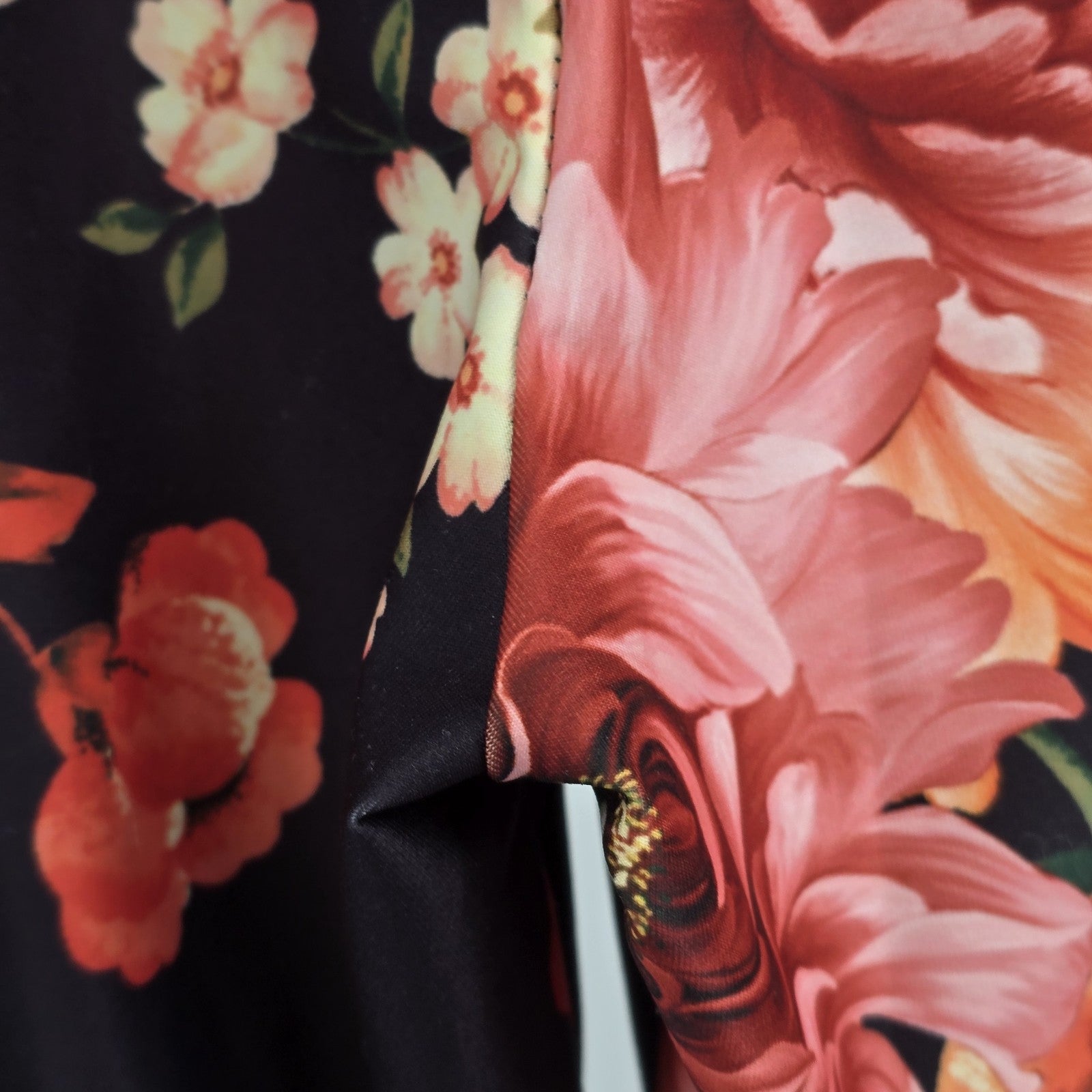 These LILY by Firmiana leggings feature a vibrant red and pink floral design on a black background, offering a chic and stylish option for casual wear. Crafted with a stretch fabric for comfort and a snug fit, these leggings are ideal for pairing with tunics, sweaters, or casual tops.