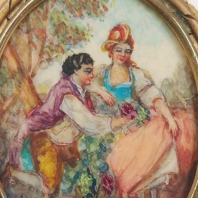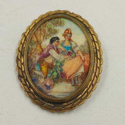Limoges Courting Couple Romantic Theme Oval Brooch Pin Gold Plate Porcelain