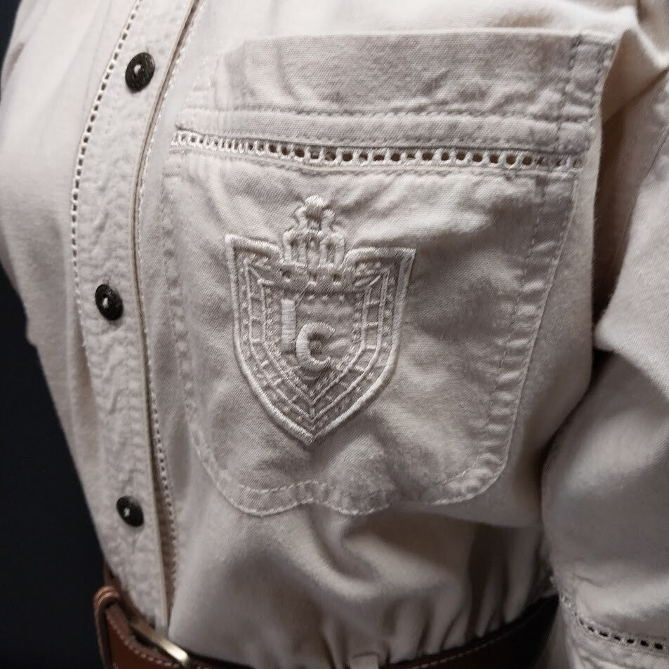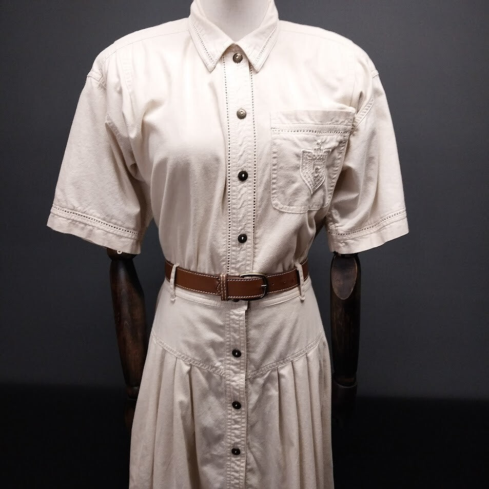 Add timeless charm to your wardrobe with this Liz Claiborne beige cotton shirt dress, a classic piece perfect for spring and summer casual wear. Featuring a collared neckline, full button-front closure, and a flattering belted waist, this midi-length dress combines comfort with elegance.
