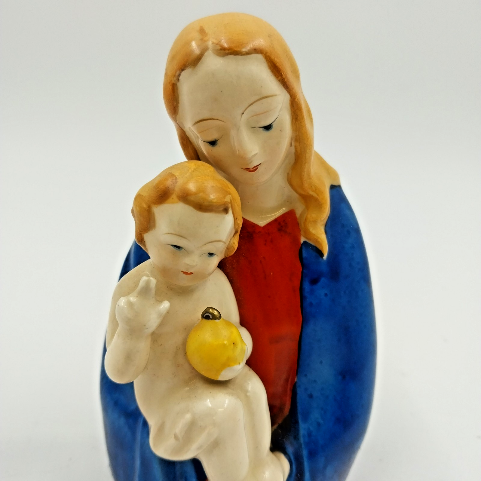 This vintage ceramic porcelain figurine depicts the Virgin Mary cradling Baby Jesus, exuding grace and tranquility. Made in Japan, this collectible piece stands as a testament to timeless craftsmanship and devotion. The elegant details and serene expressions make it a perfect addition to any religious or vintage collection.