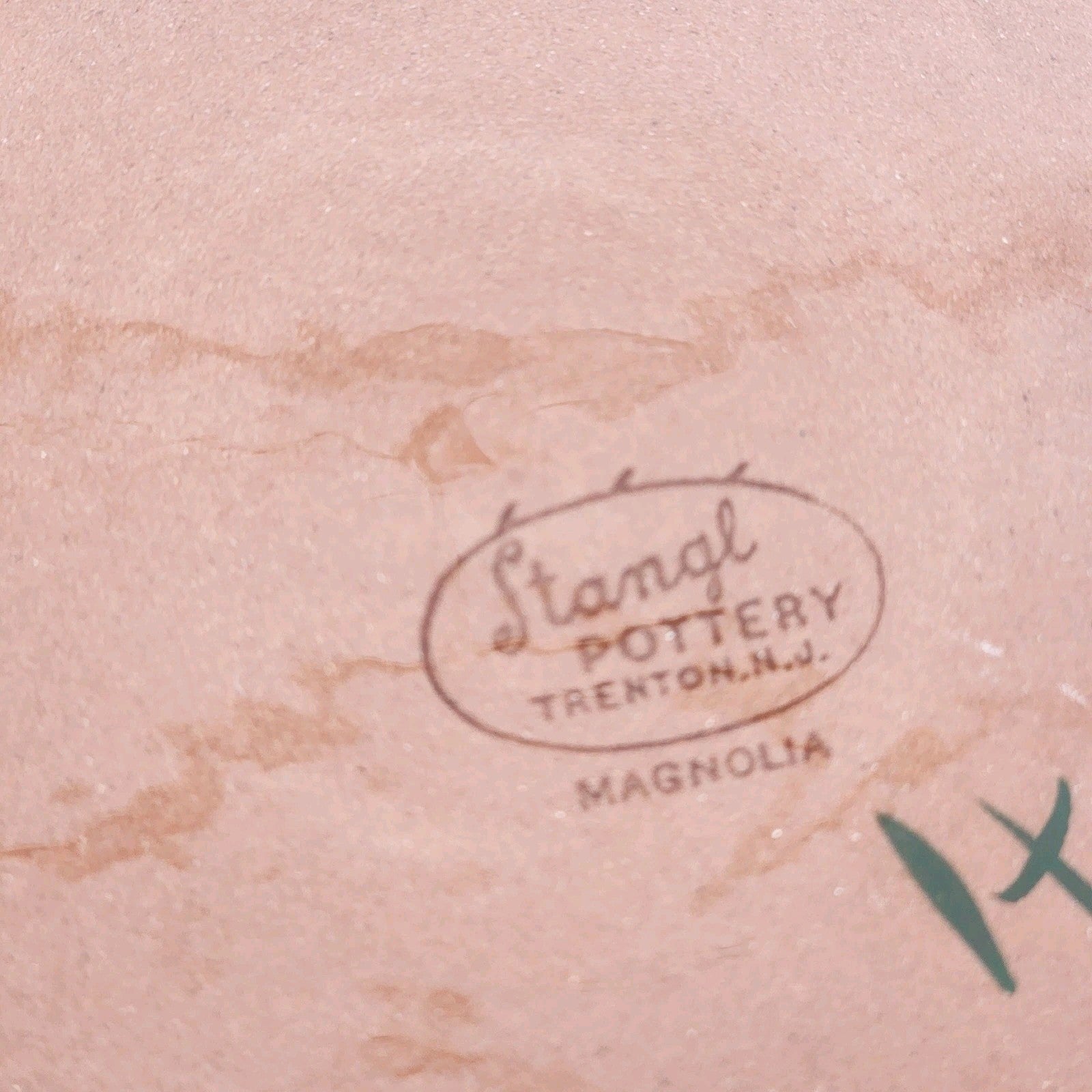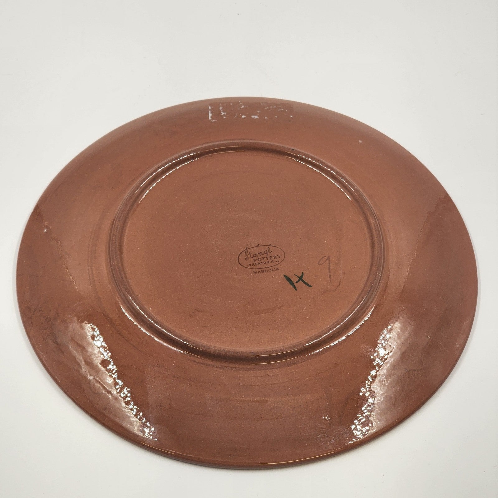 This is a vintage Stangl Pottery dinner plate from 1955, featuring a Magnolia flower pattern on a green glossy stoneware material. The round plate has a diameter of 10 inches and a height of 1 inch. It is designed in an Americana style and is stackable. The plate is a part of a set that includes one dinner plate. Made in the United States, it weighs 1.3 lbs and is meant for hand wash only.