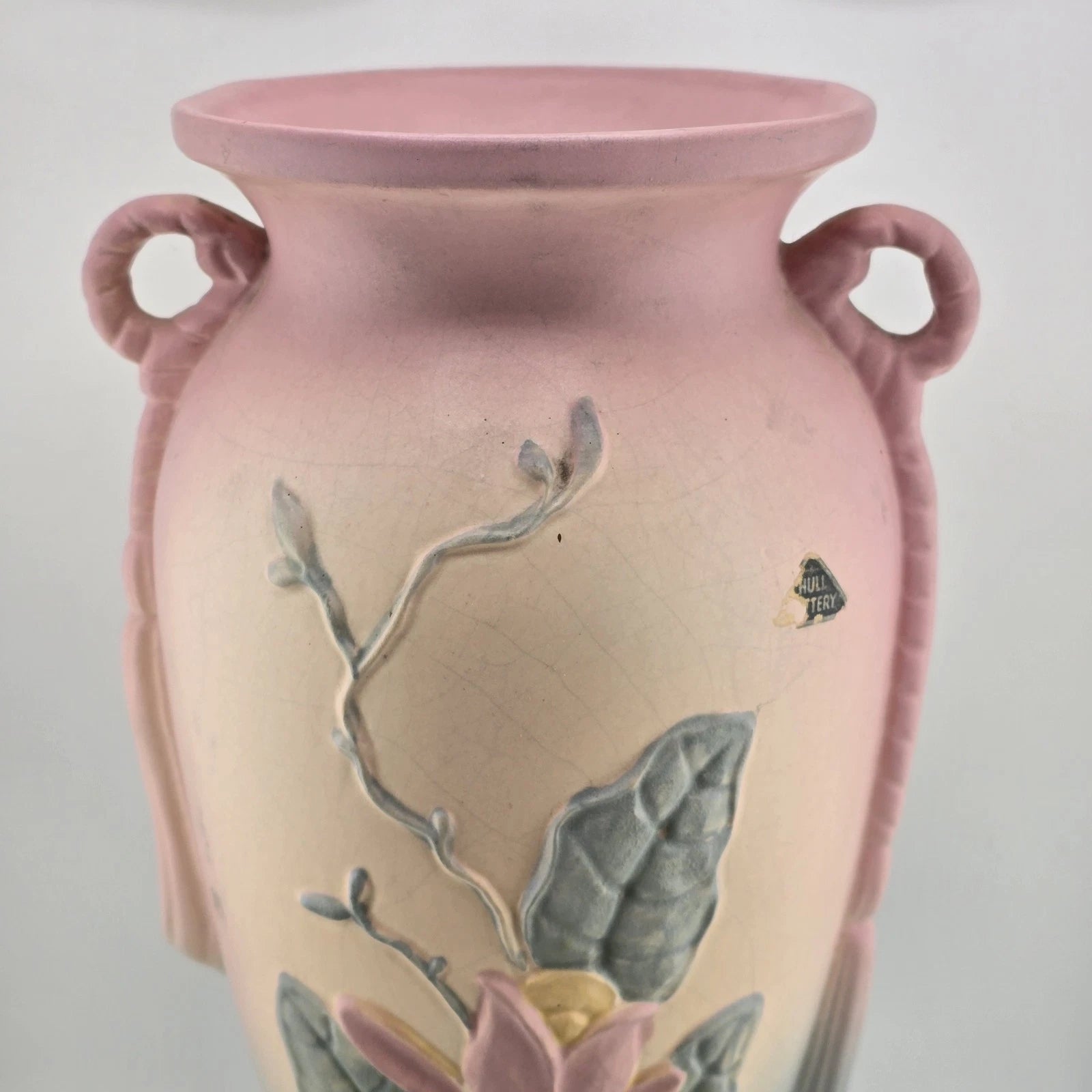 Magnolia Trophy Vase Hull Art Pottery 12.5" Matte Pink Flower Tassel Handle