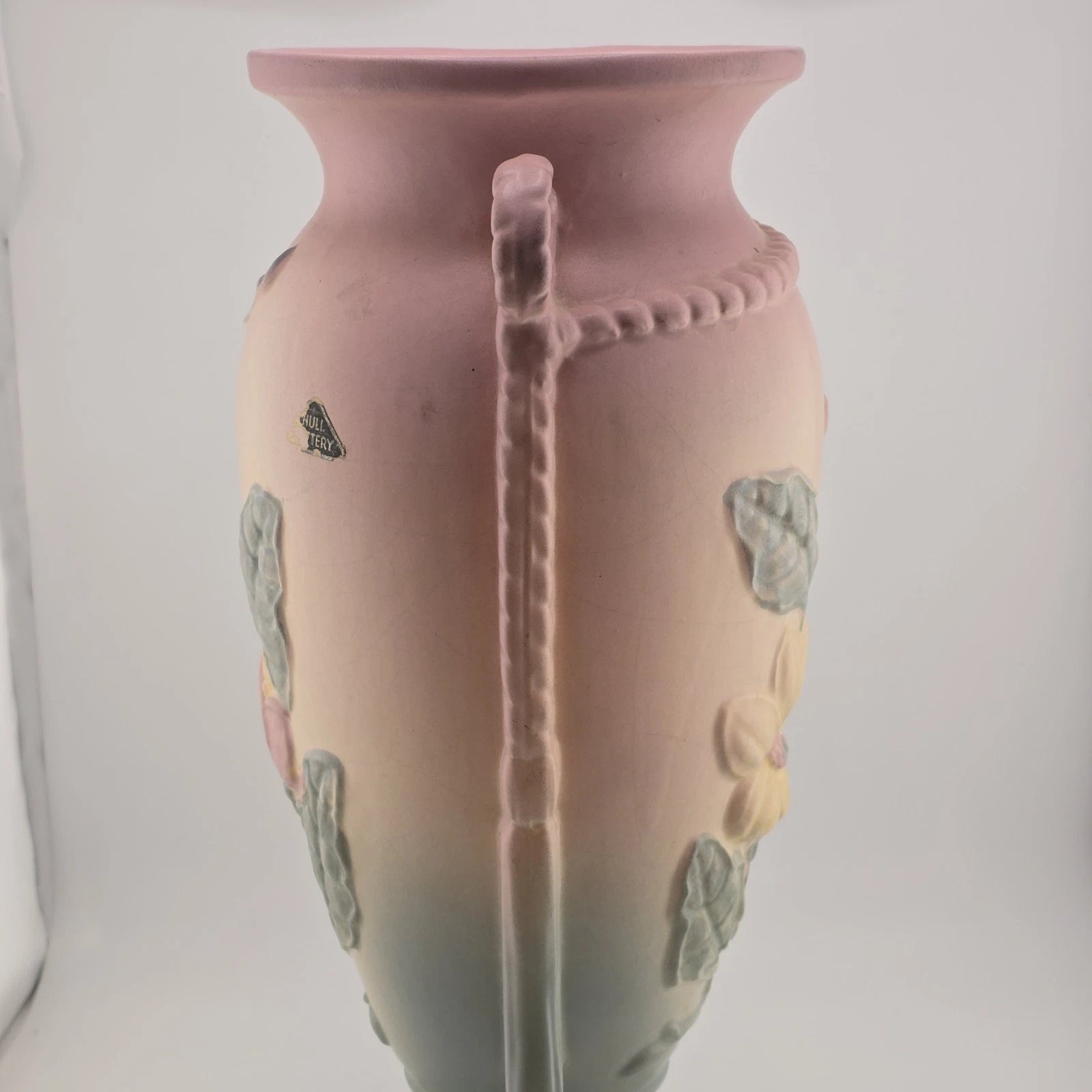 This stunning vintage 1940s Hull Art Pottery trophy vase is a masterpiece of mid-century American ceramics. Part of the highly collectible "Magnolia" line, it features a sophisticated satin matte glaze that transitions from a soft pastel pink at the scalloped rim to a serene sage green at the base. The front is adorned with a hand-painted yellow and pink magnolia blossom in high relief, complemented by elegant rope-and-tassel handles. Standing over a foot tall, this substantial piece serves as both a functional floral vessel and a standout statement piece for any art pottery collection.