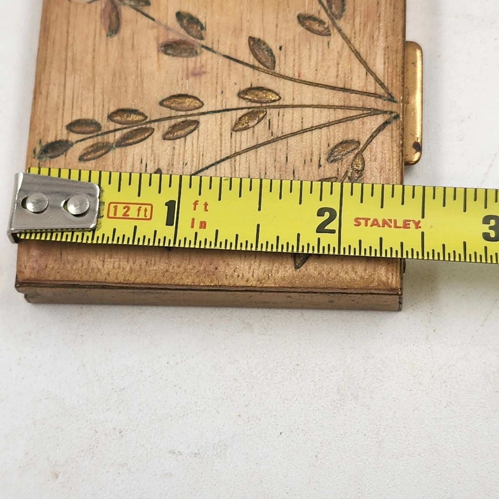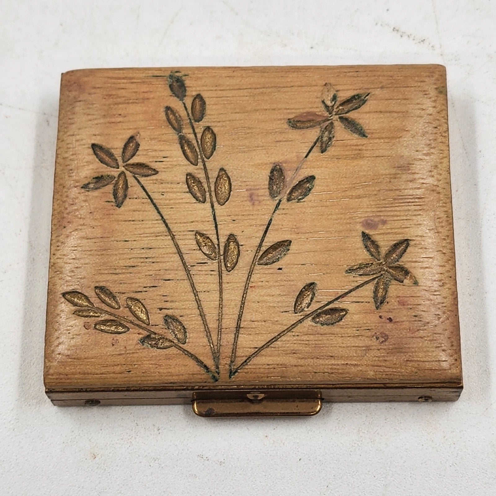 This is a unique vintage make-up compact or small powder case from the Mid-Century Modern (MCM) era, likely dating to the 1960s. It features a stunning contrast between its decorative carved wooden top-which showcases a botanical/floral pattern-and the functional, hinged brass powder case base with a metal clasp closure and interior mirror. This is a delightful collectible for anyone who loves vintage vanity accessories.