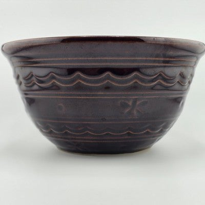 The Marcrest Stoneware 1 Qt Mixing Bowl in the Daisy & Dot Pattern is a unique and nostalgic kitchen collectible from the 1950s. Made in the USA, this round bowl features a charming brown color with a delightful daisy and dot design. With a capacity of 1 quart, it is perfect for mixing and serving a variety of dishes for all occasions. The ovenproof stoneware material ensures durability and easy maintenance, making it a valuable addition to any kitchen.