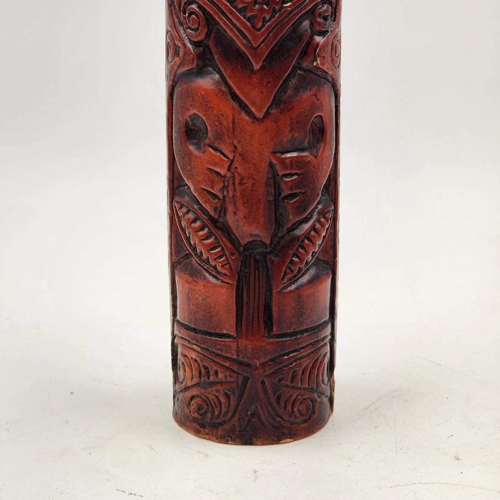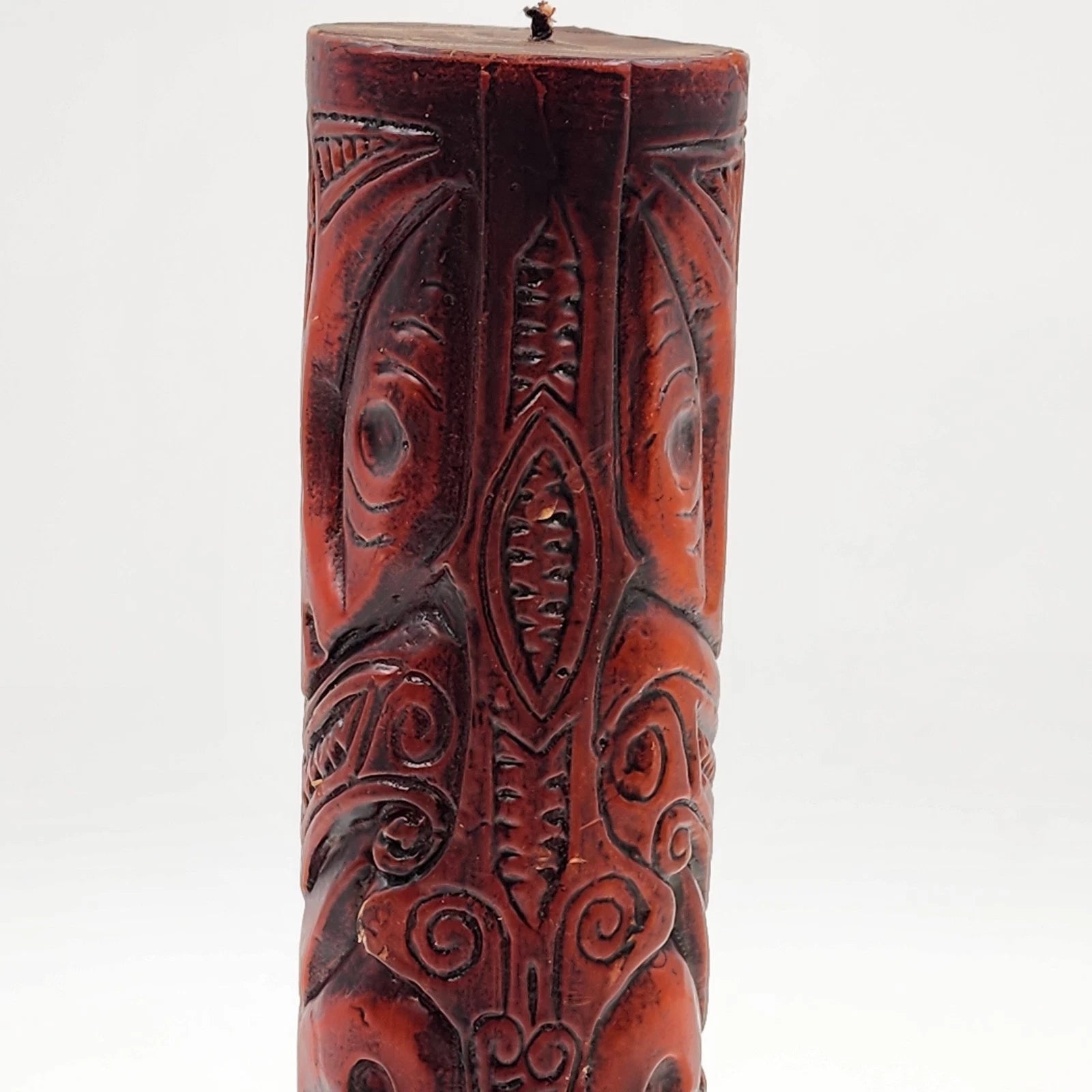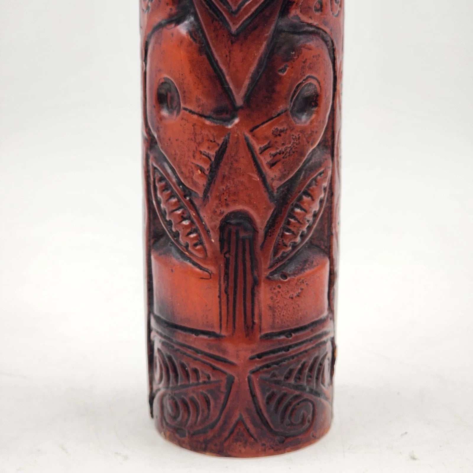 This vintage Marquesan Tiki candle sculpture stands 12.5 inches tall and is finished in a rich dark red color. Made in Canada, it showcases detailed carving inspired by traditional Polynesian and Hawaiian tiki art, symbolizing ancestral and spiritual figures.