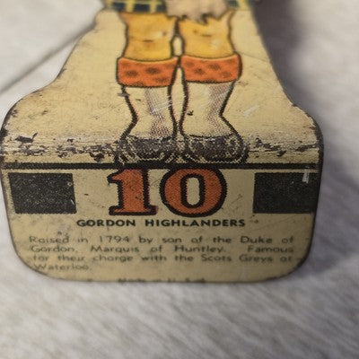 Add a piece of military history to your collection with this vintage MARX 1930s Gordon Highlanders #10 tin litho army soldier. This flat tin figure represents a Scottish Highland regiment soldier in detailed lithographed uniform, making it an excellent toy prop, collectible, or display piece.
