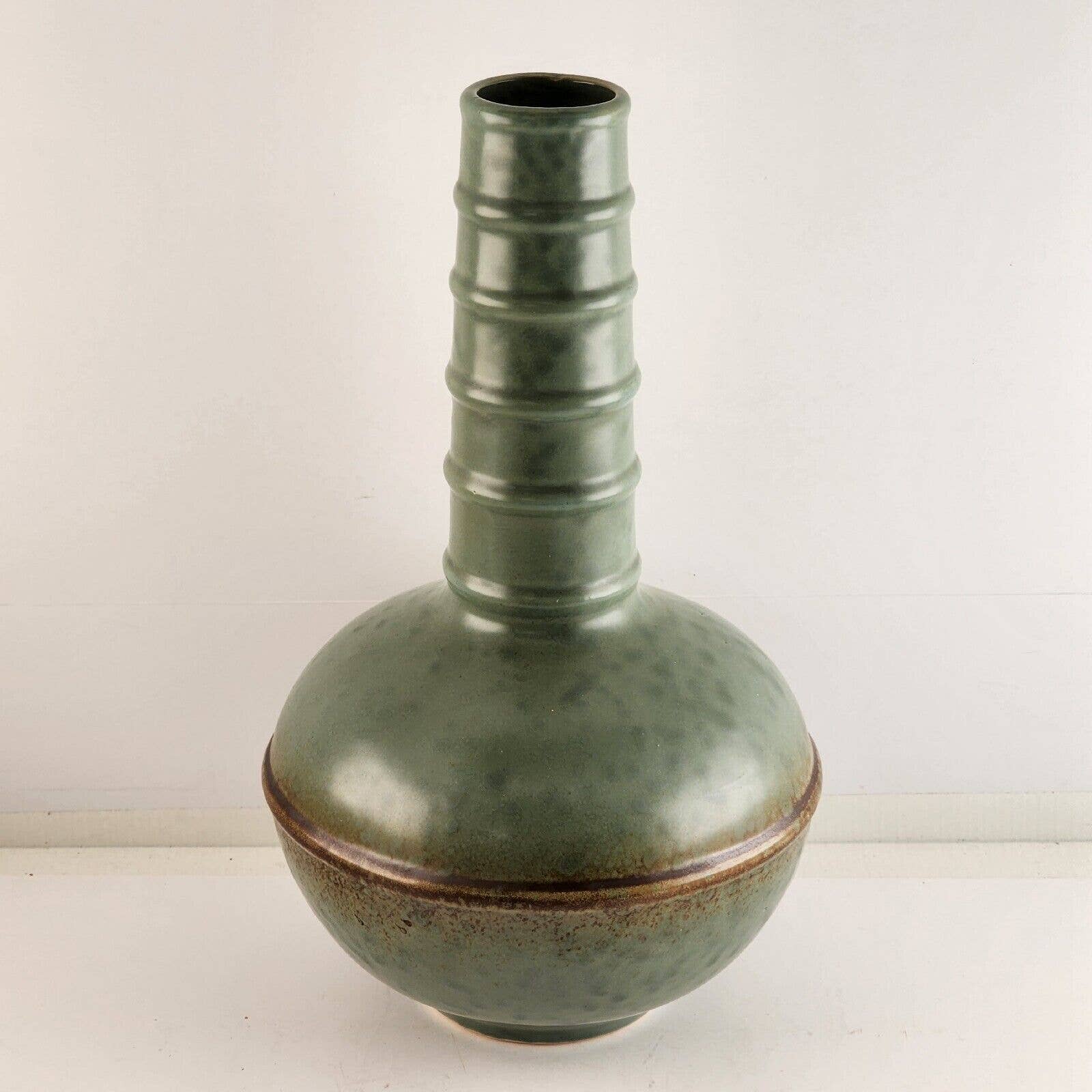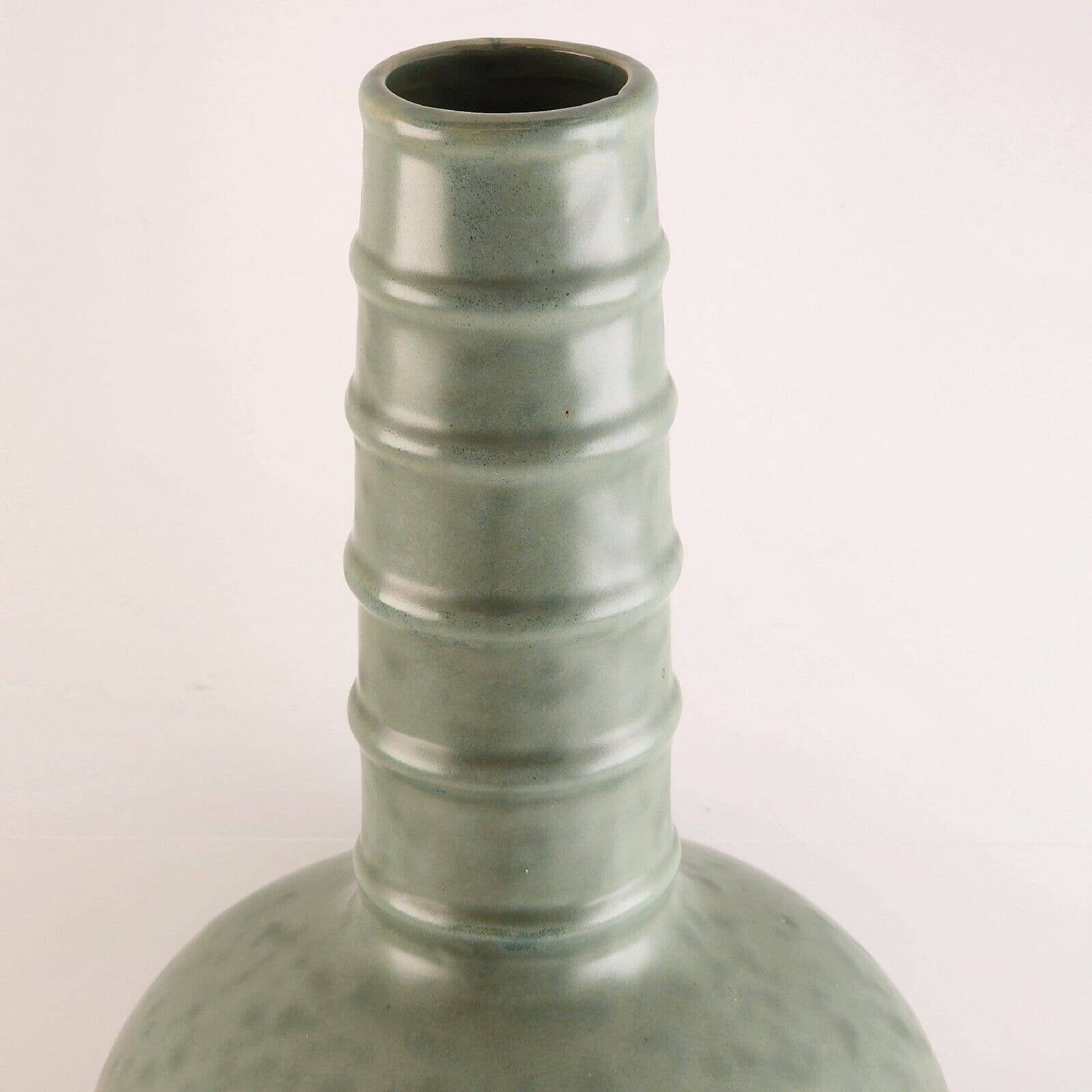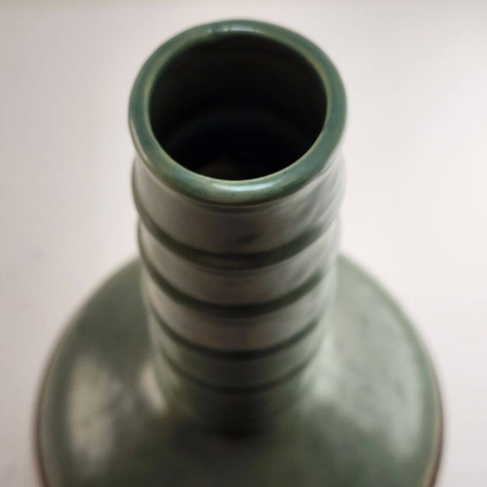 Matte Green Pottery Chimney Vase Arts & Crafts Modern Ribbed 7" w x 12¼" h (17.8 x 31.1 cm)