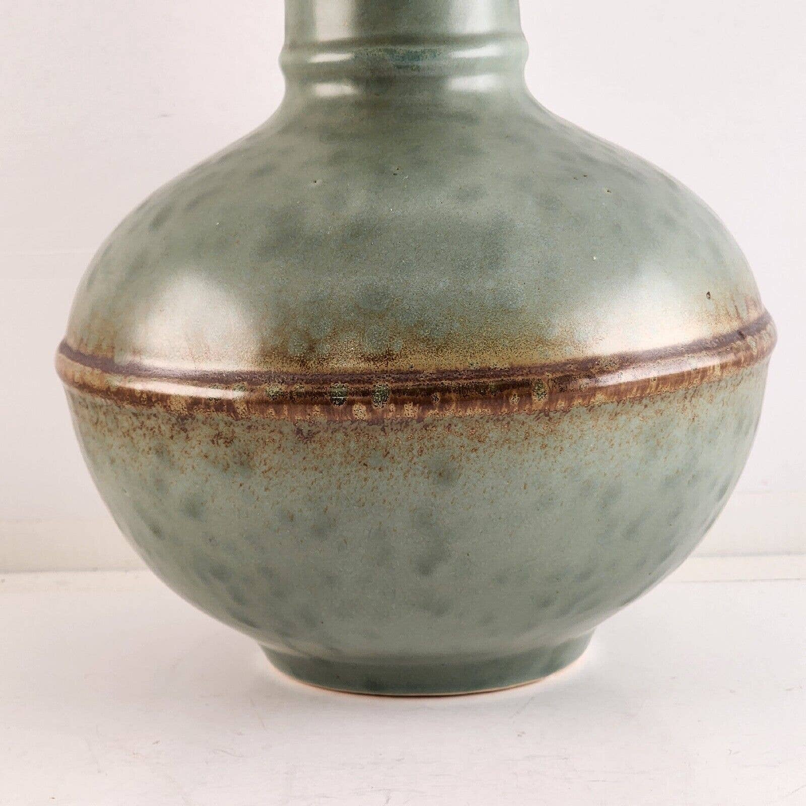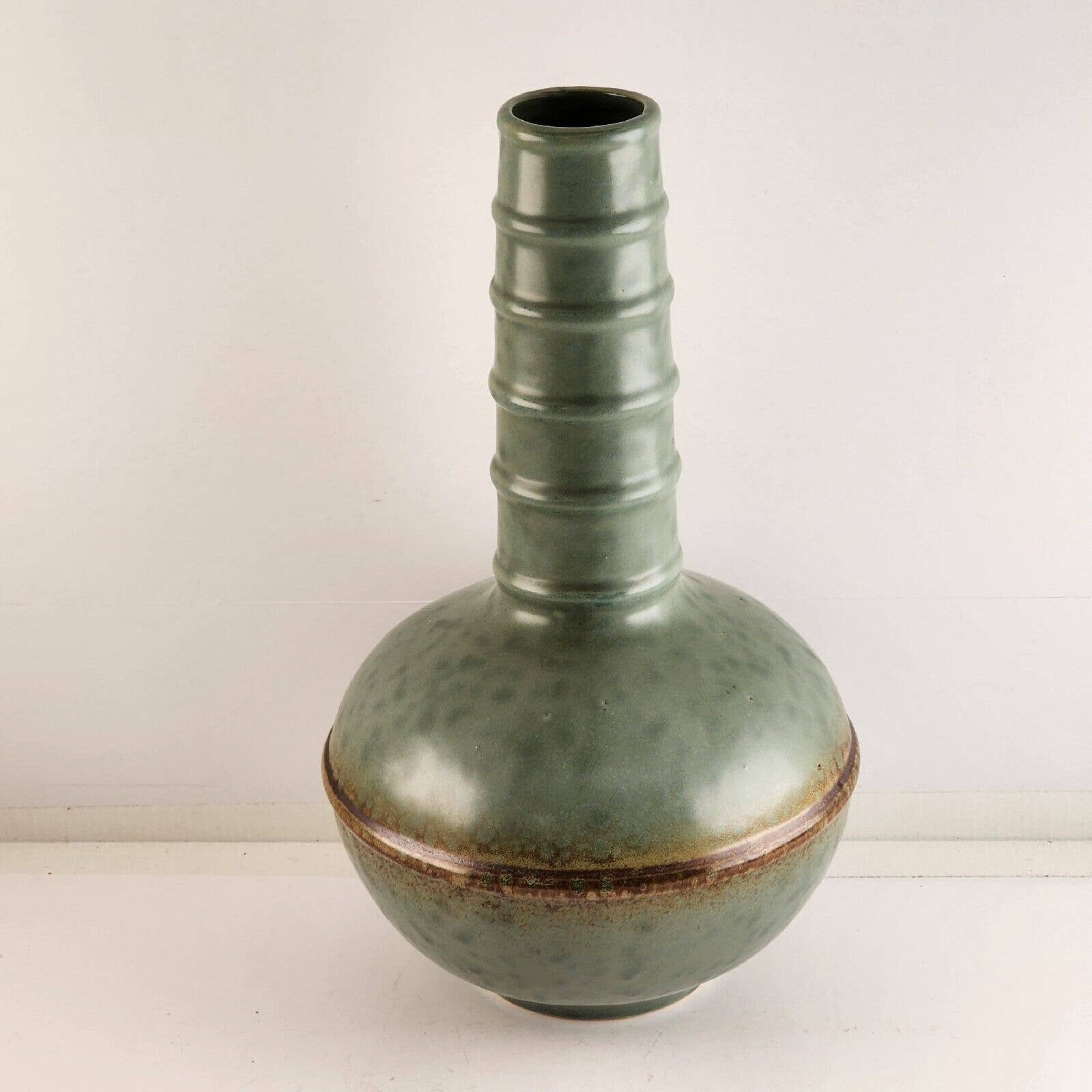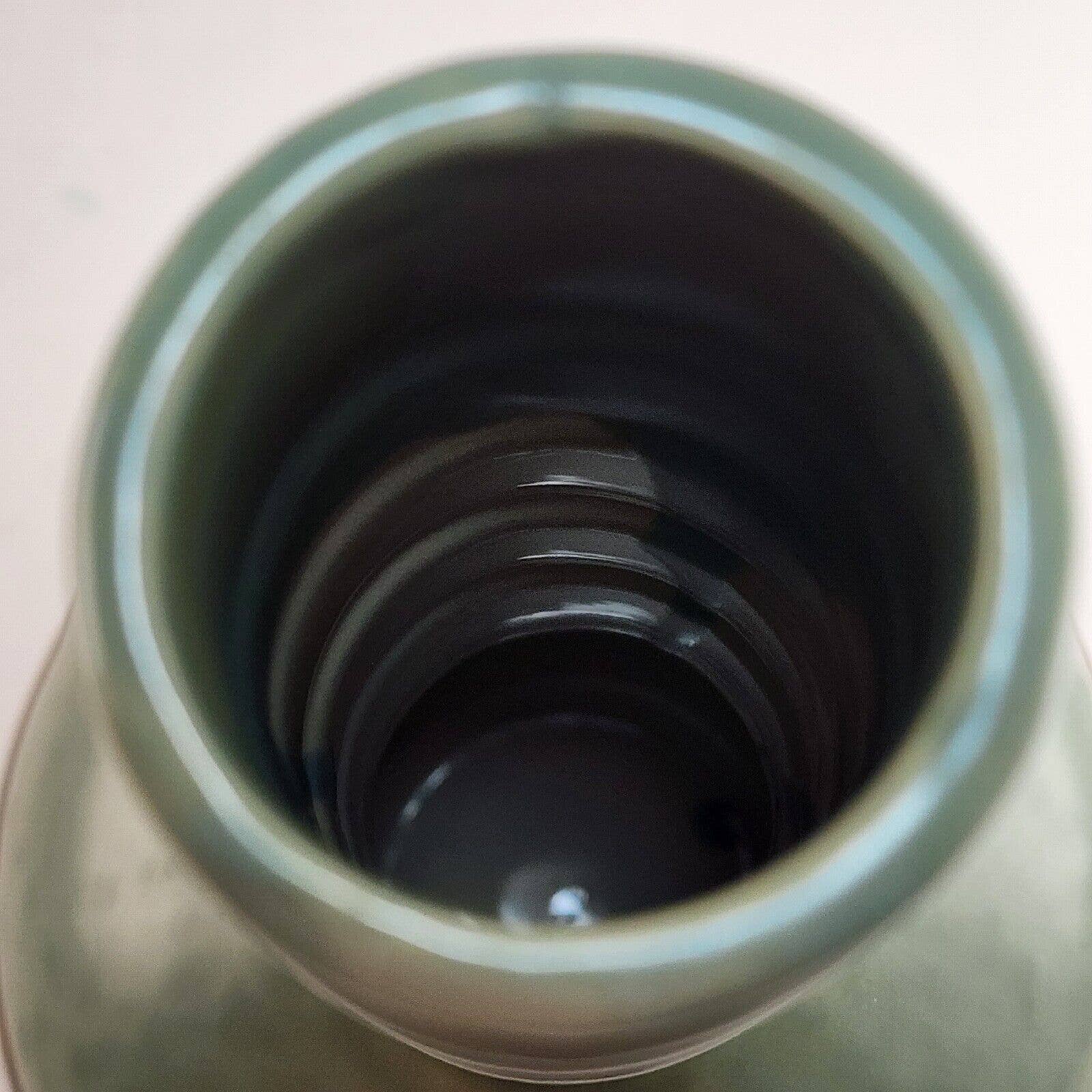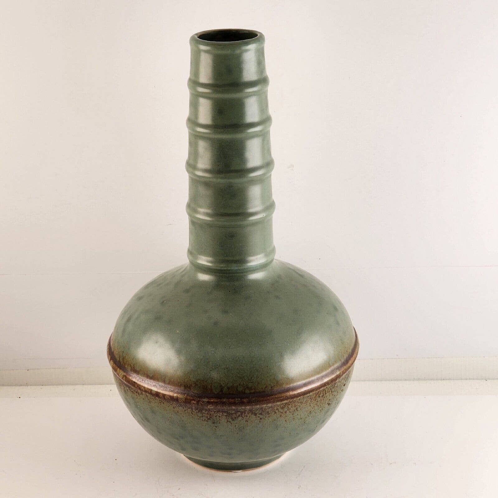 Matte Green Pottery Chimney Vase Arts & Crafts Modern Ribbed 7" w x 12¼" h (17.8 x 31.1 cm)
