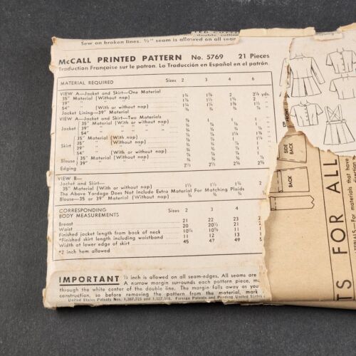 McCall's 5769 Vintage Sewing Pattern '40's Child's 2 Piece Suite Blouse Size 2 4 6