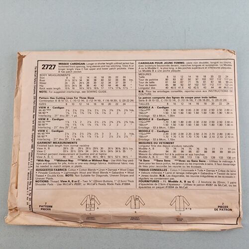 McCall's 2727 Vintage Sewing Pattern '86 Misses Cardigan Jacket