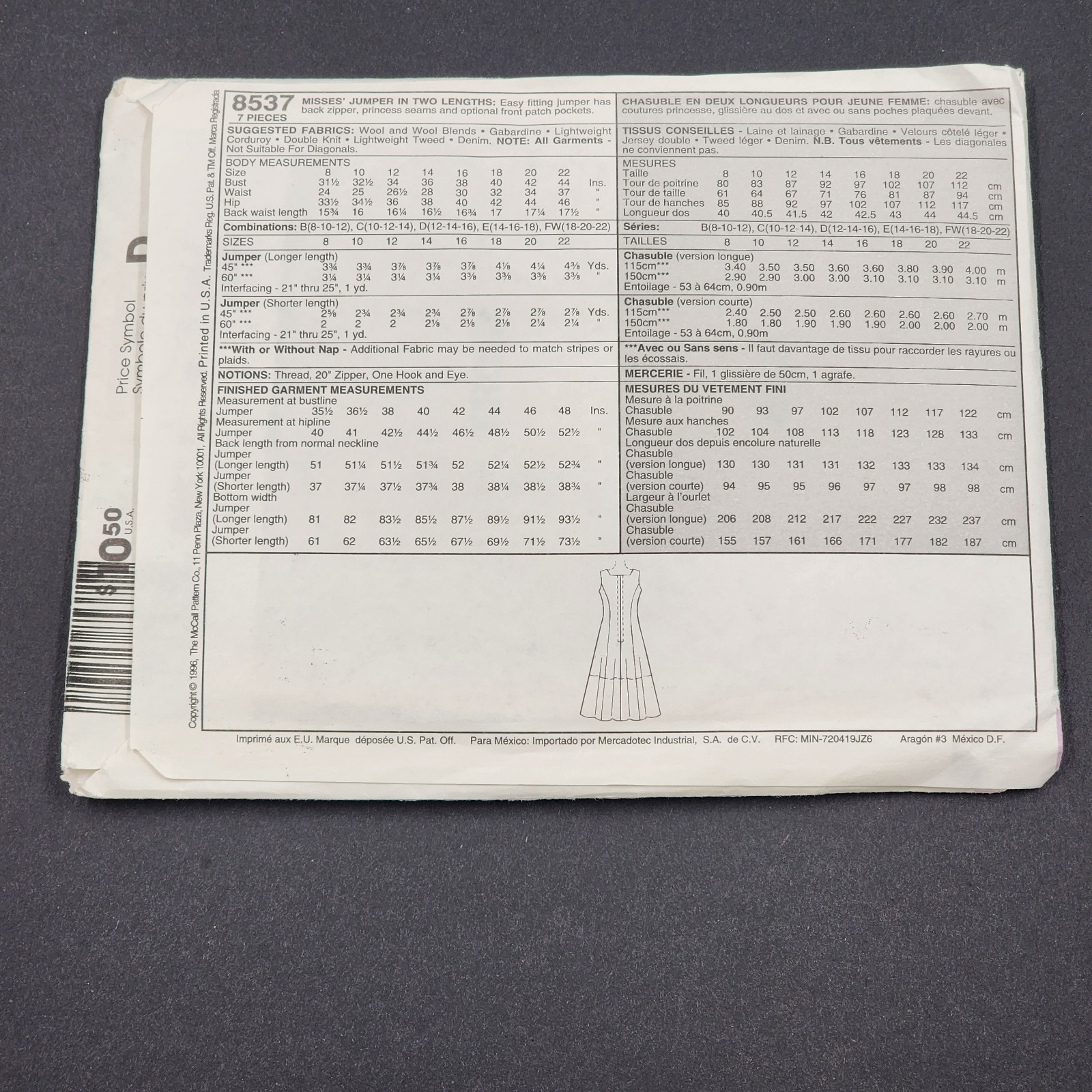 McCalls 8537 Vintage Sewing Pattern 1996 Uncut 2-Hr Pleated Jumper Size B 8-12