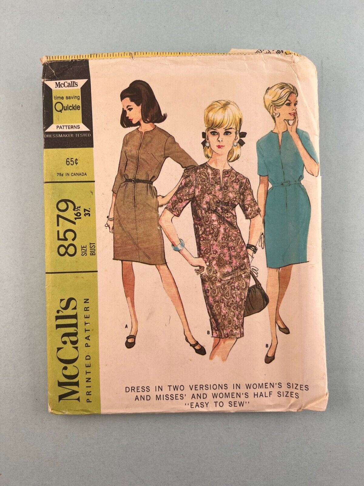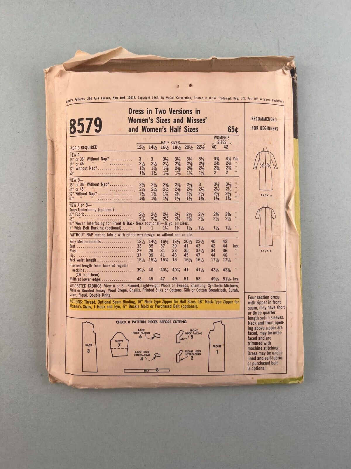 McCall's 8579 Vintage Sewing Pattern '66 Women Misses ½Size Dress 2 Versions 16½