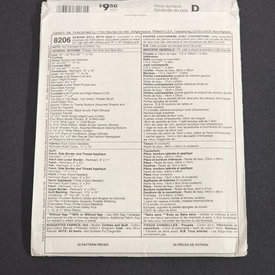 McCall's Craft 8206 Vintage Sewing Pattern 1996 Uncut Sewing Doll and Wall Quilt