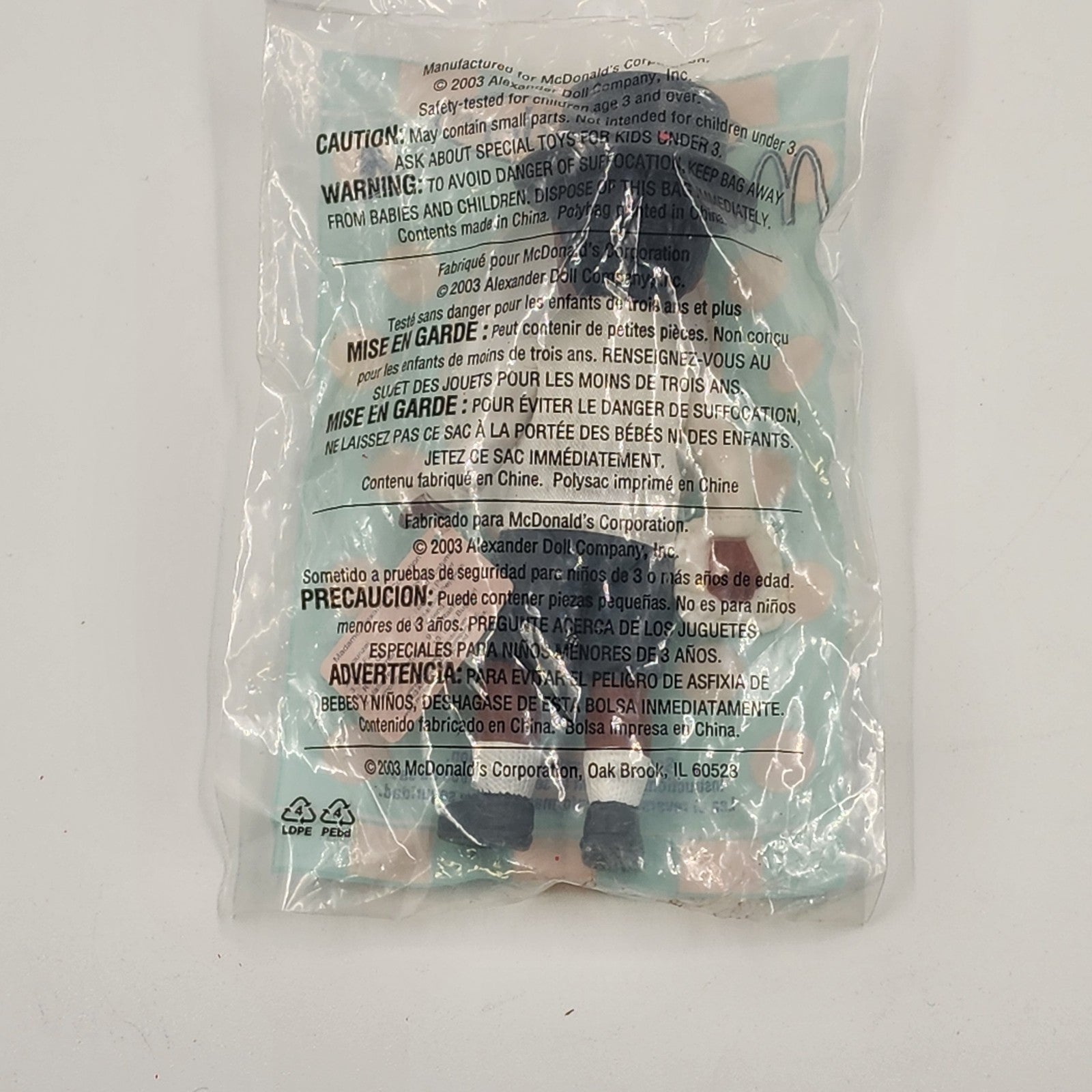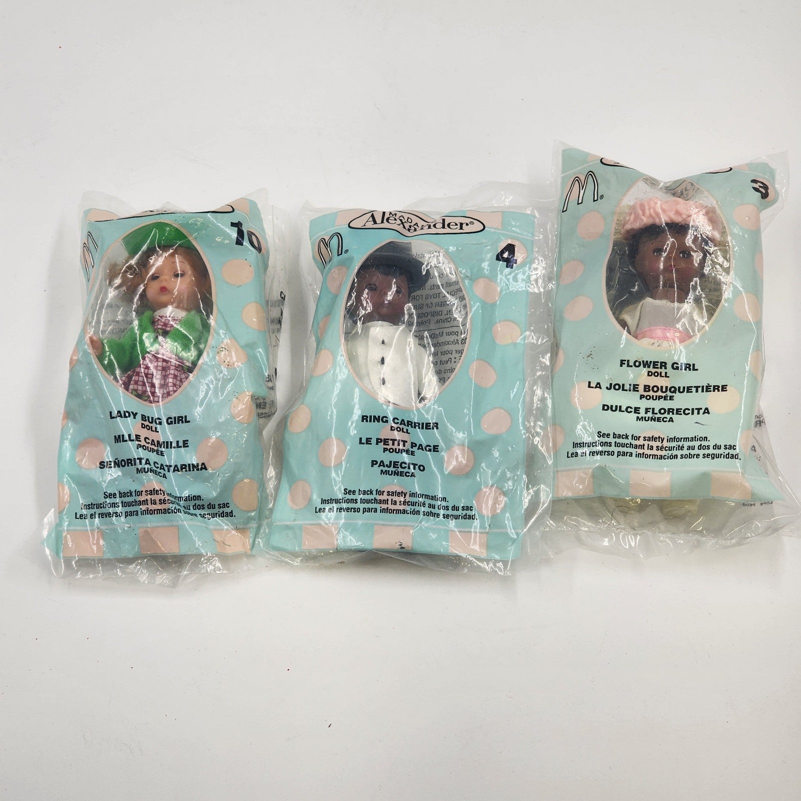 This product is a lot of 3 sealed Happy Meal toy dolls from McDonald's 2003 collection, featuring characters from the Madame Alexander brand. Each doll comes in its original sealed packaging and represents a themed character. These collectible toys are ideal for children aged 3 and above or for fans of Madame Alexander dolls.