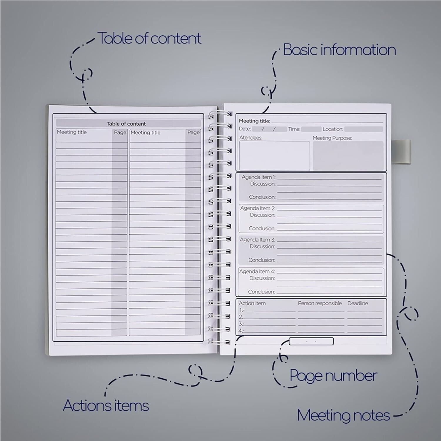 In this Meeting Planner you will find everything you need to keep track of your meetings: You can detail the day, time and place, as well as who attended. In your Notebook For Work you can define the item, topic of discussion and conclusions. With Action Items.