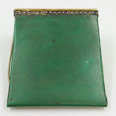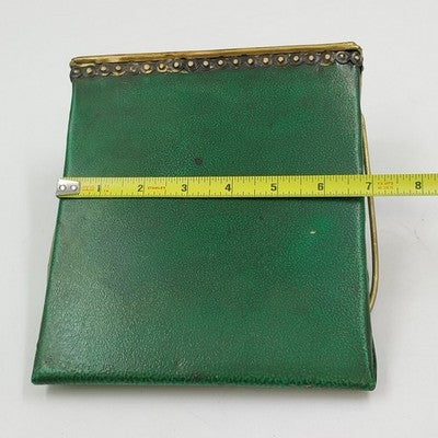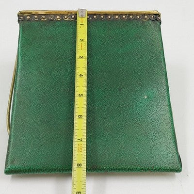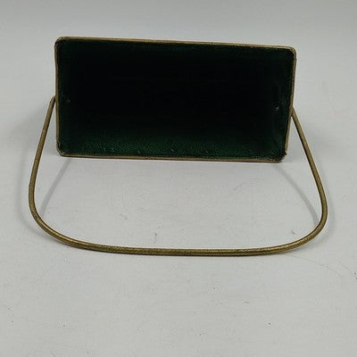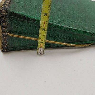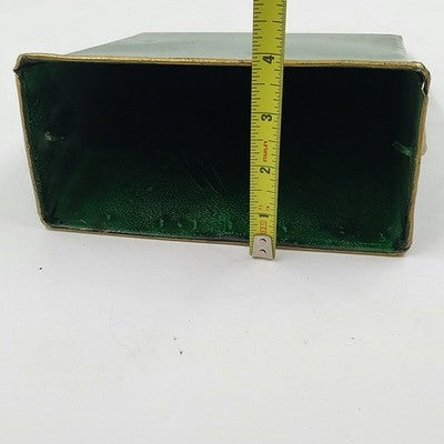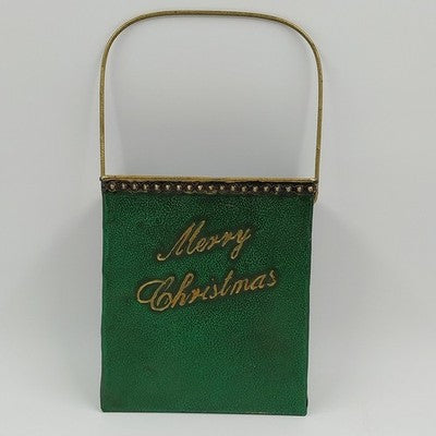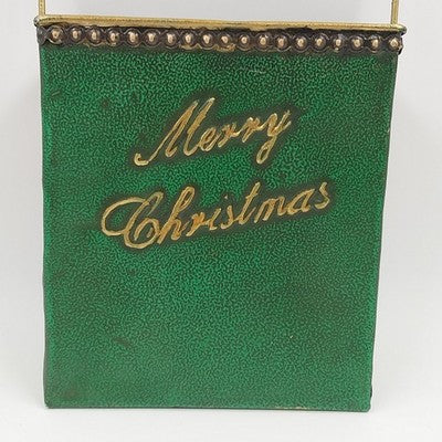 Charming vintage wedge-shaped metal Christmas box, designed to hold holiday cards. The box is painted green with the words "Merry Christmas" in gold lettering across the front. A festive and practical way to organize or display holiday greetings.