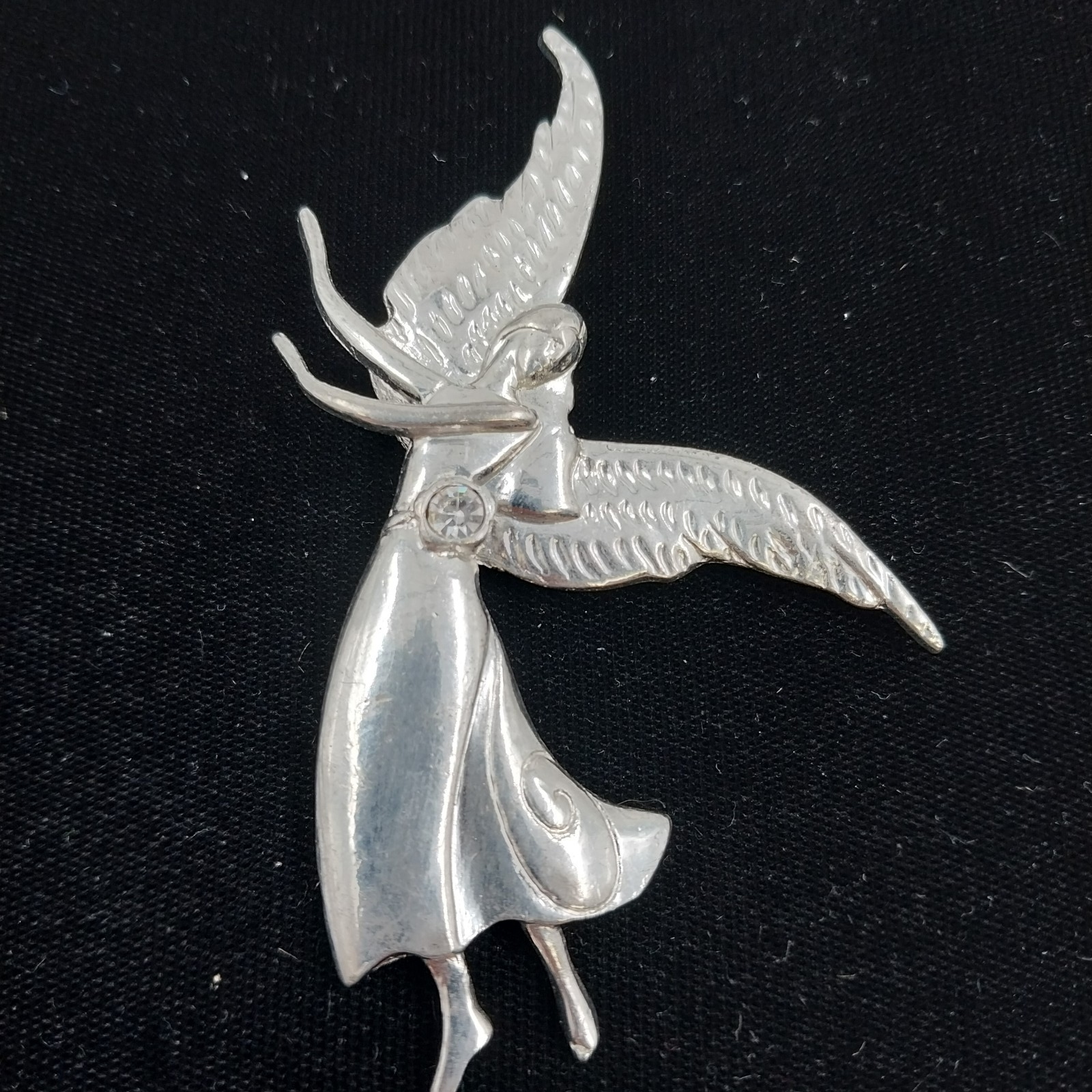 Metal Pewter Angel Brooch Pendant April Birthstone Diamond Crystal 3"Pin Vintage