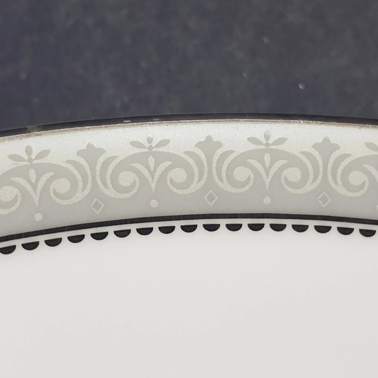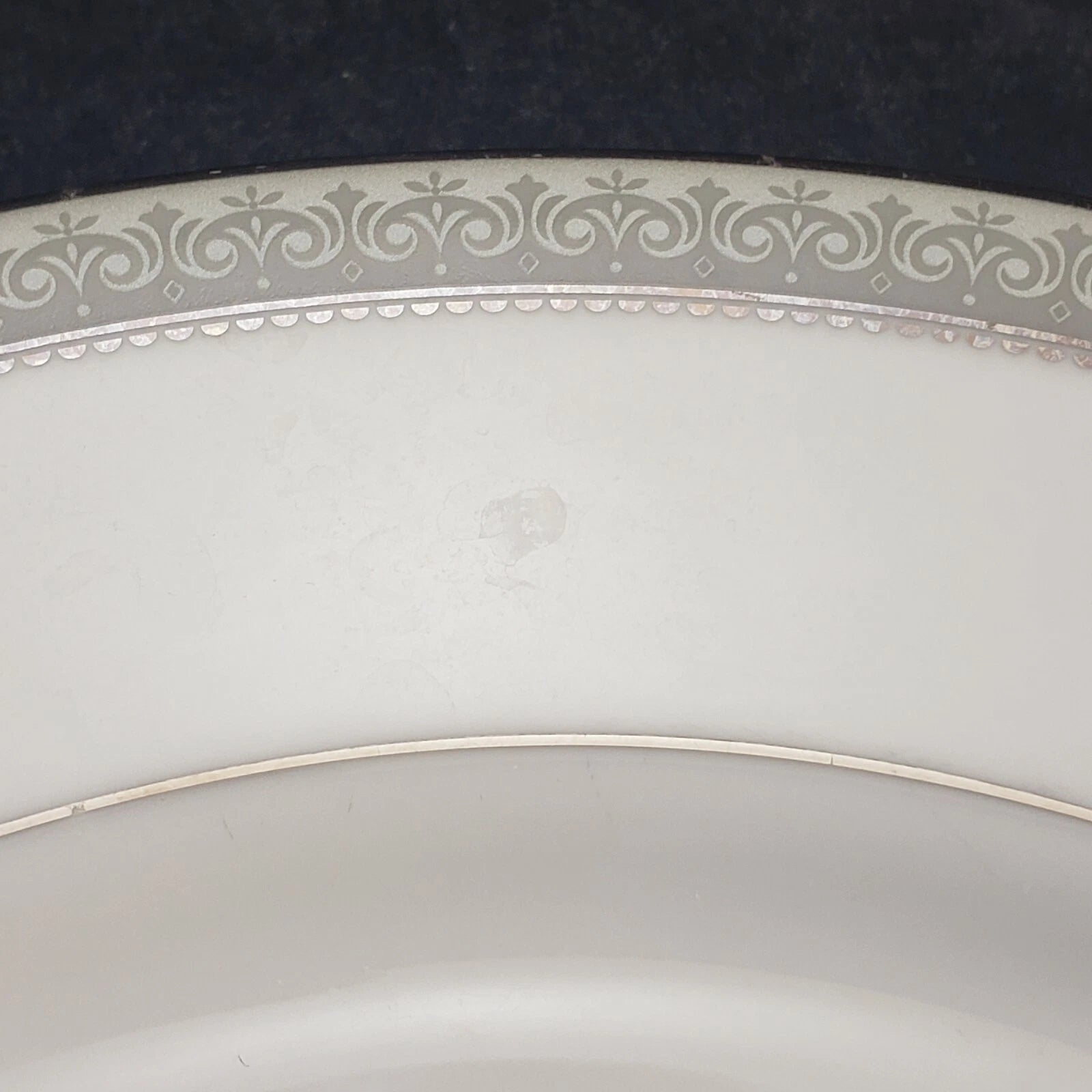 Elegant Mikasa Platinum Crown Fine China Dinner Plate in pattern L3428, crafted in Thailand. This vintage piece features a sophisticated gray-to-silver edge border that adds a touch of timeless beauty to any table setting.