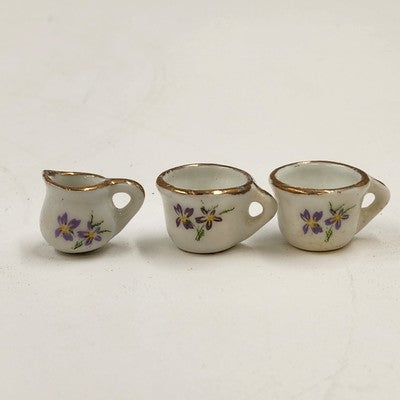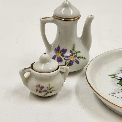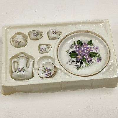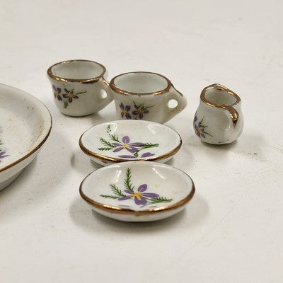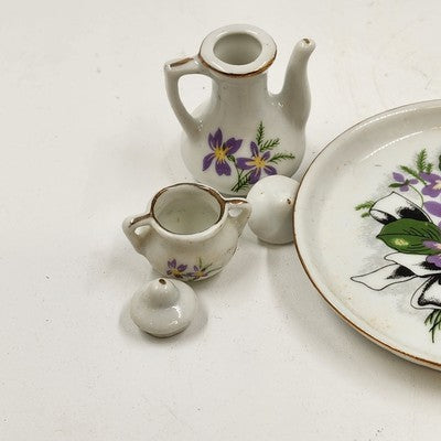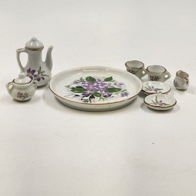 Elevate your collection or tea party decor with this vintage Miniature Tea Party Set for two. Featuring a pristine white porcelain base adorned with delicate purple lily flowers and gold rim accents, this charming set brings elegance and timeless beauty. Perfect for display or imaginative play, it's an ideal gift or collectible for tea lovers.