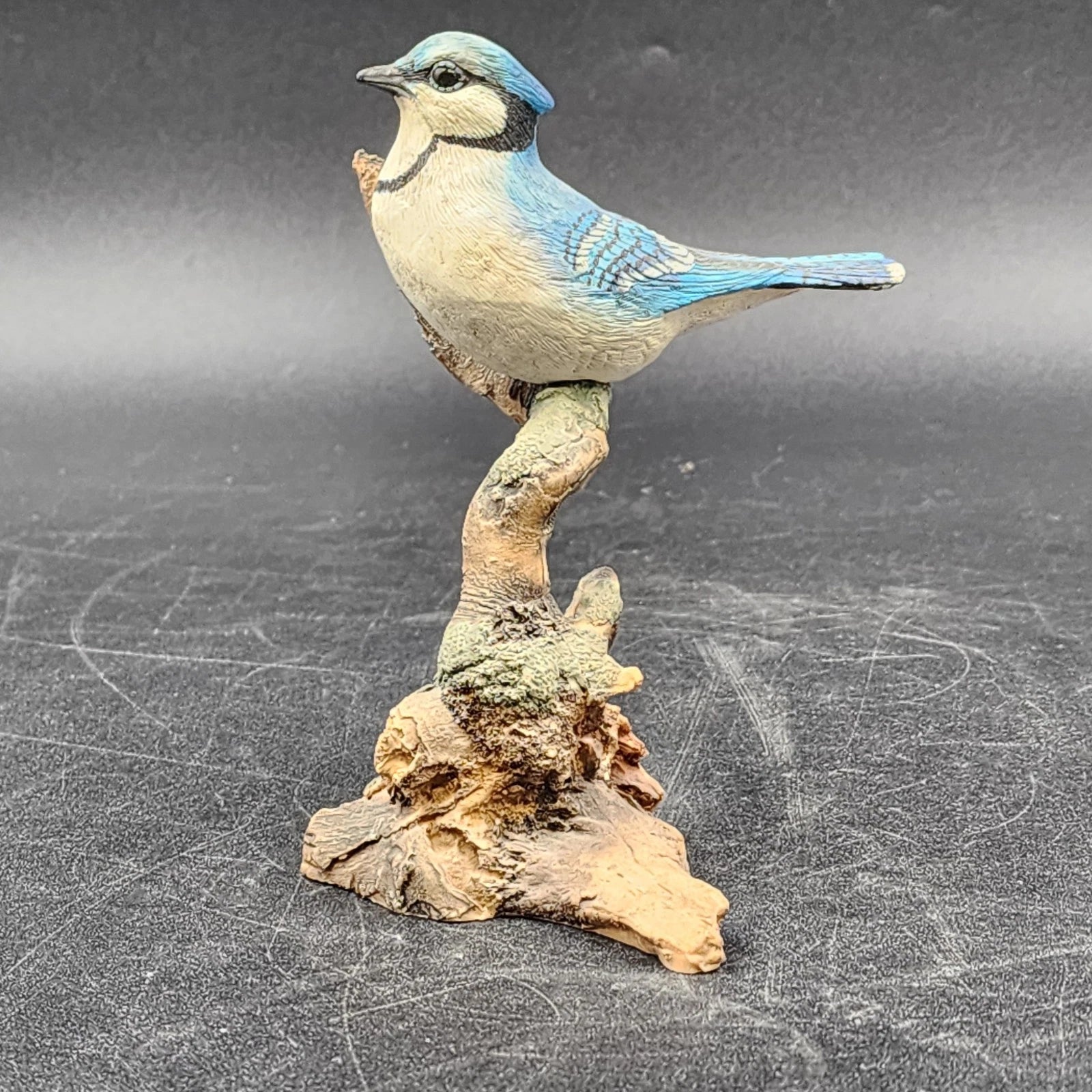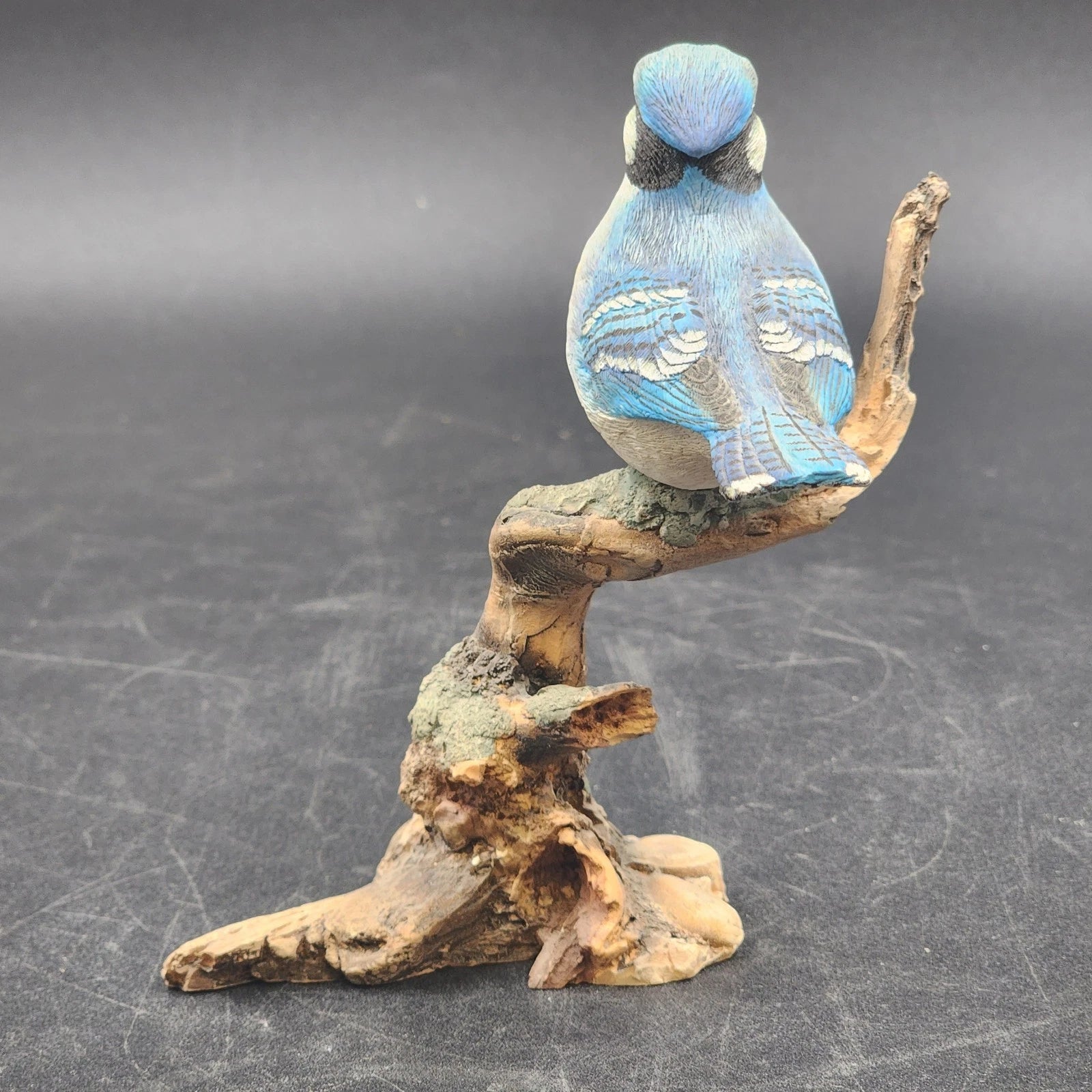 Molded Painted Blue Jay Bird Sculpture Resin 5.5" Perched On Branch Figurine Vtg