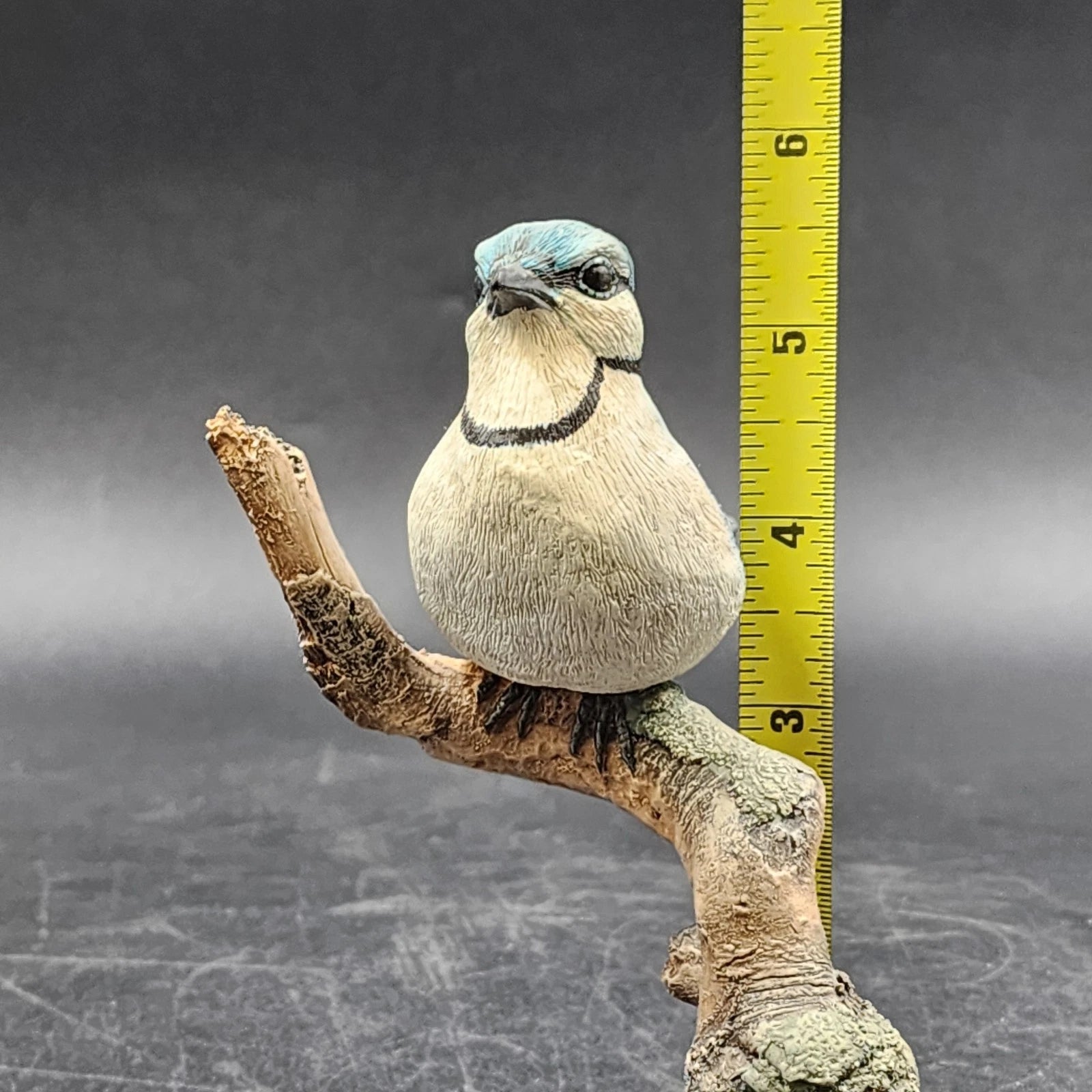 This molded and hand-painted resin sculpture features a lifelike blue jay perched on a branch. With intricate detailing and vibrant colors, it makes a charming decorative piece for display on shelves, desks, or as part of a bird or nature collection.