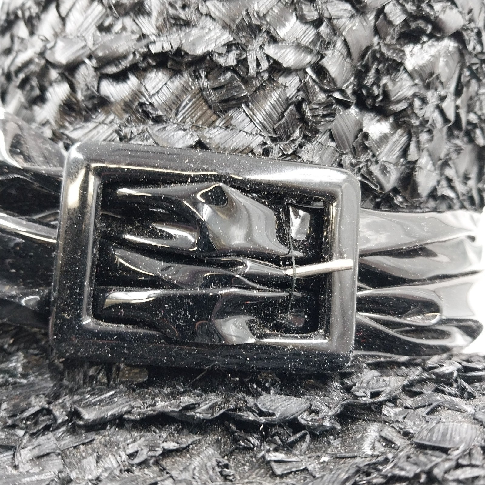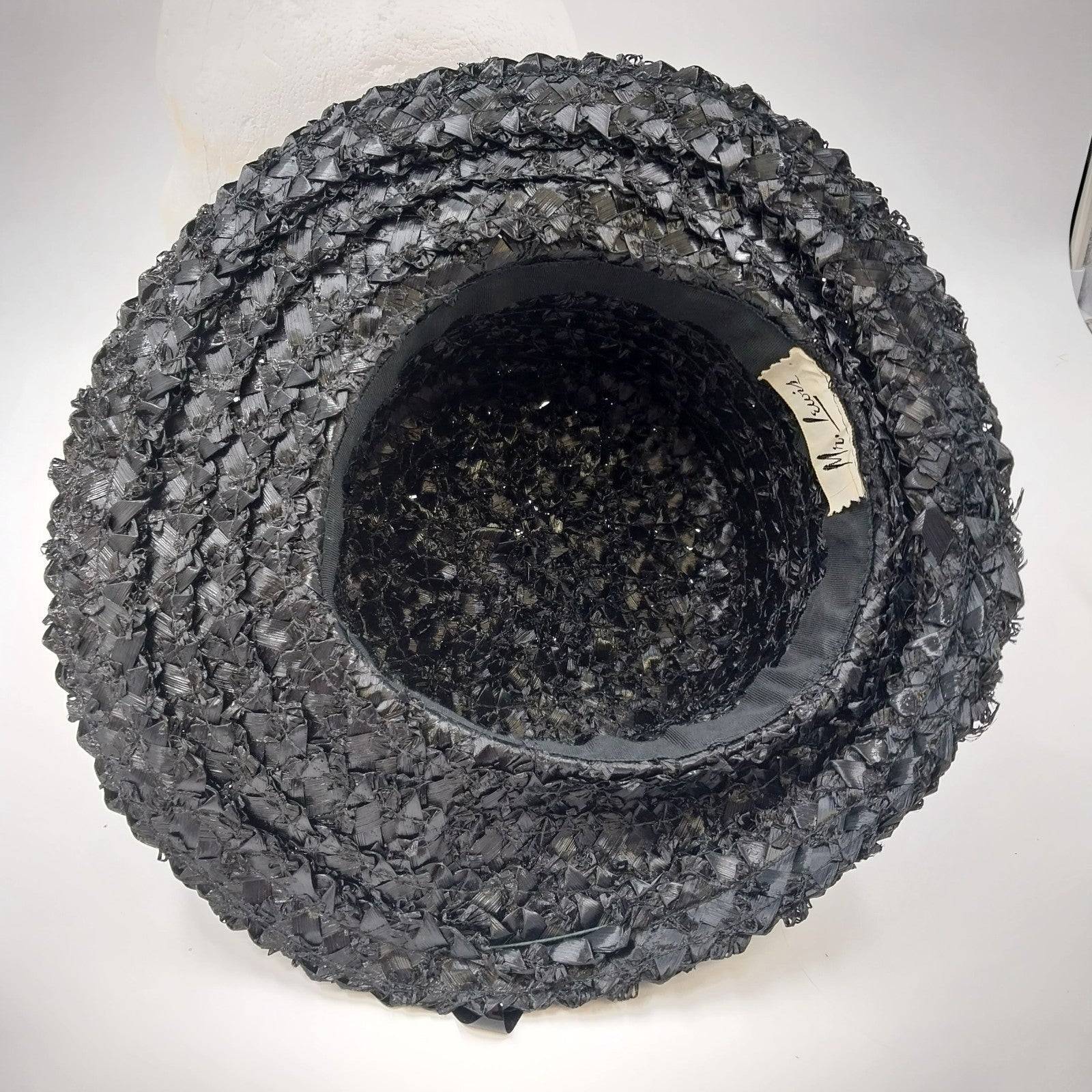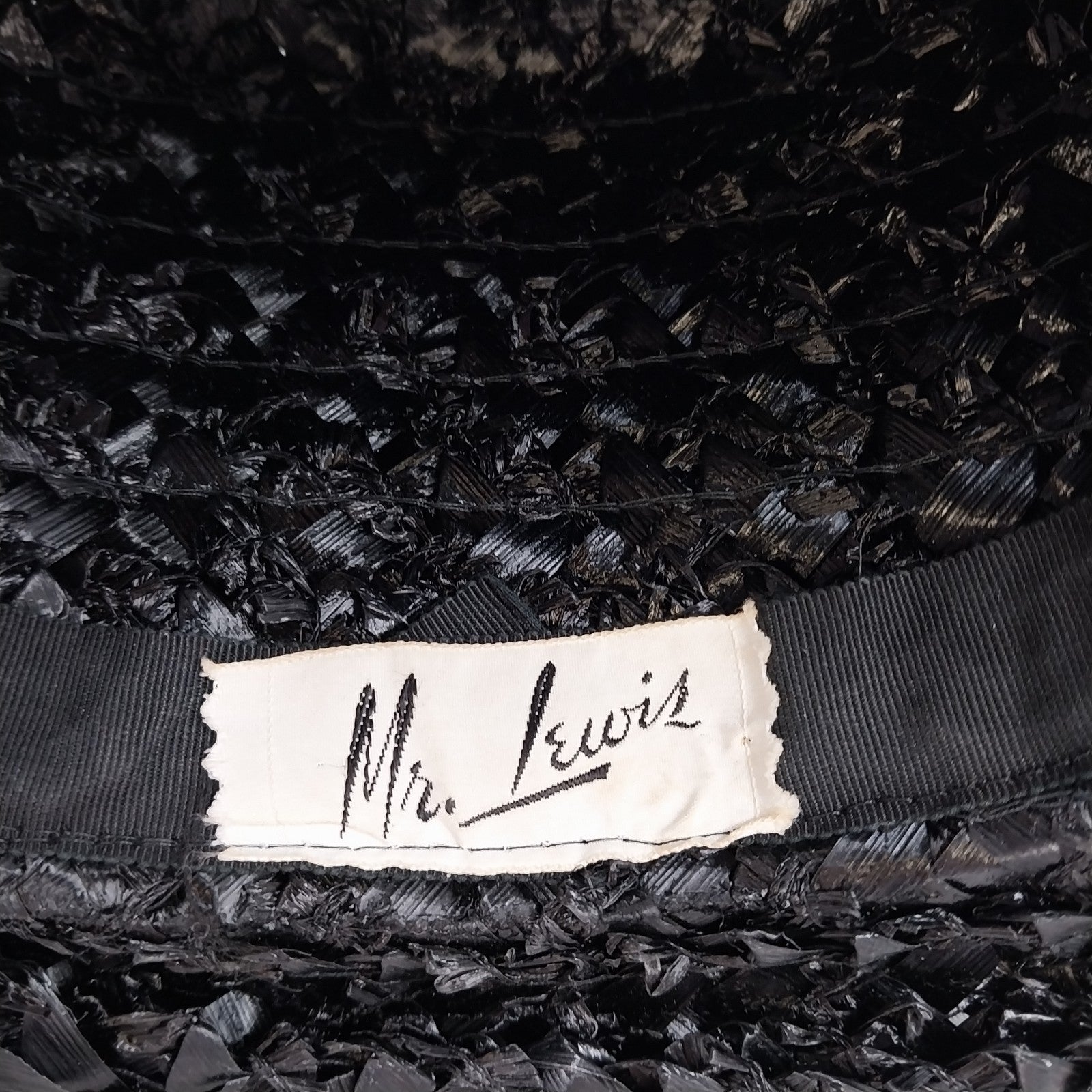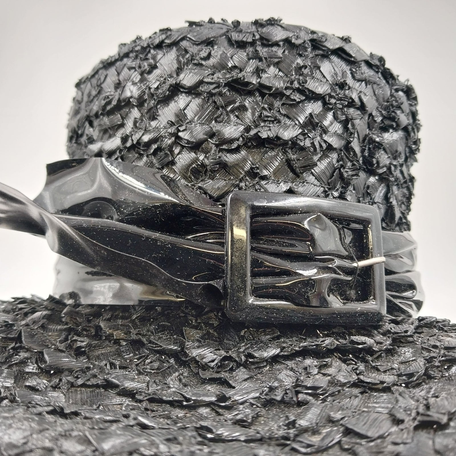 Vintage Mr. Lewis raffia woven straw hat in sleek black, featuring a tall crown and a wide brim. Accented with a bold black plastic ribbon and a charming buckle, this Mary Poppins-style hat exudes timeless sophistication.