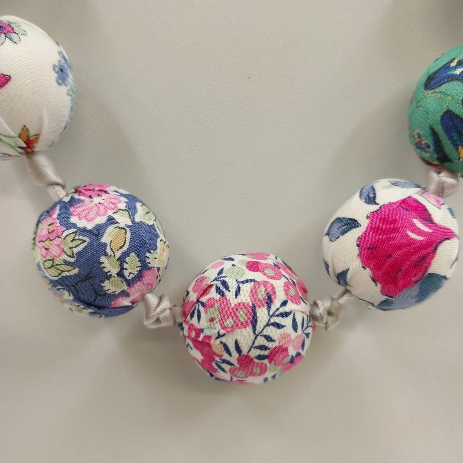 Add a fun and colorful accent to your outfit with this vintage multicolor fabric-covered beaded necklace. Each bead is knotted between soft fabric and finished with a pink satin ribbon that allows you to adjust the length to your liking. Perfect for casual or boho-inspired looks.