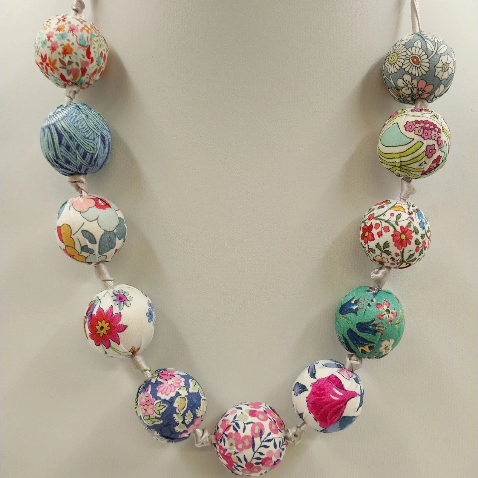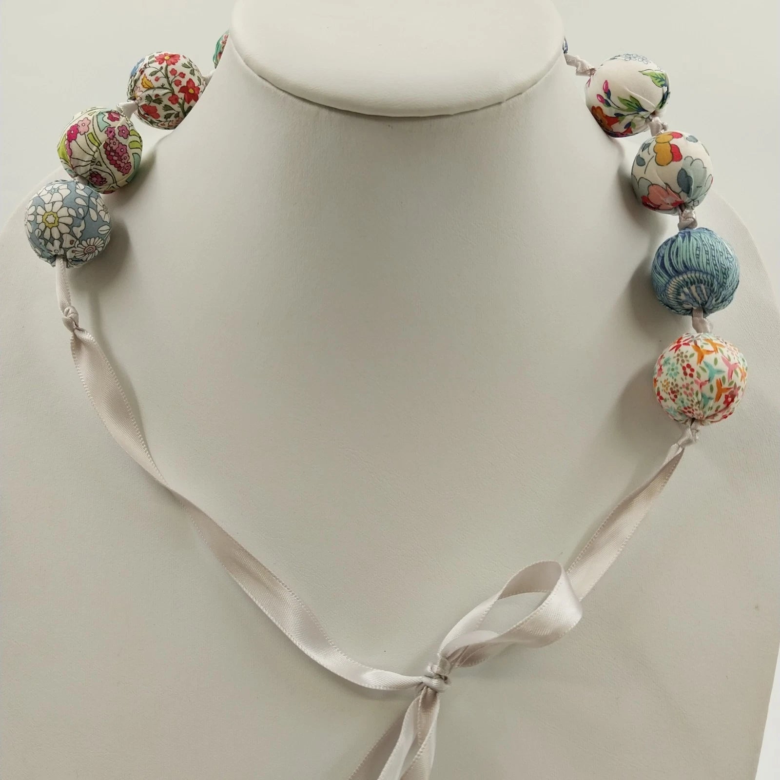 Multicolor Fabric Covered Beaded Boho Necklace Adjustable Satin Ribbon Tie