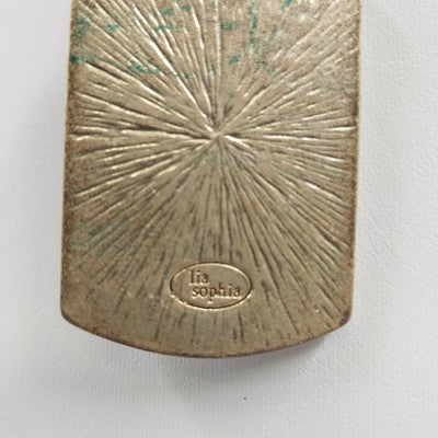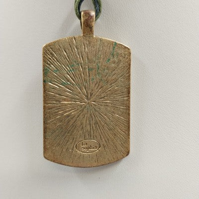 This elegant Liz Sophia necklace features a gold-tone pendant with a multicolor stained-glass design made of mica and resin. It is paired with a stylish corded chain, offering versatility and charm.
