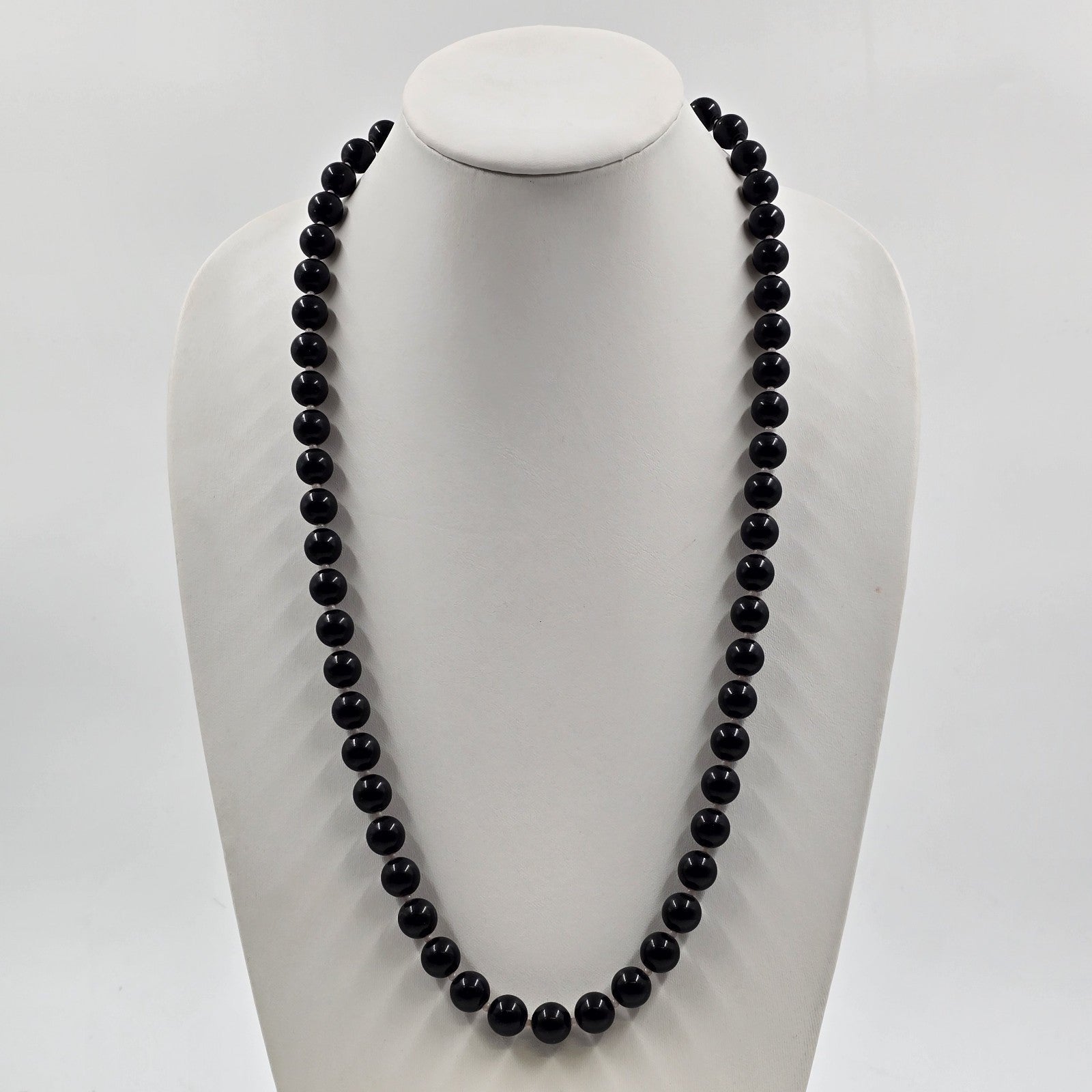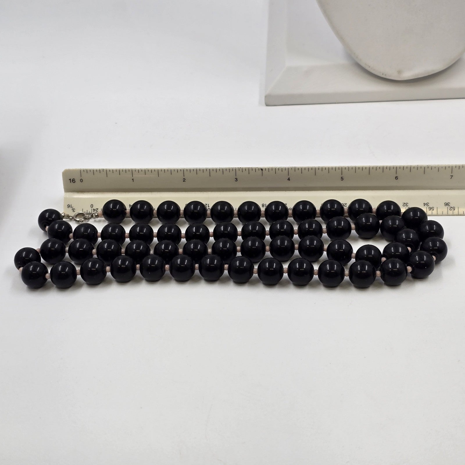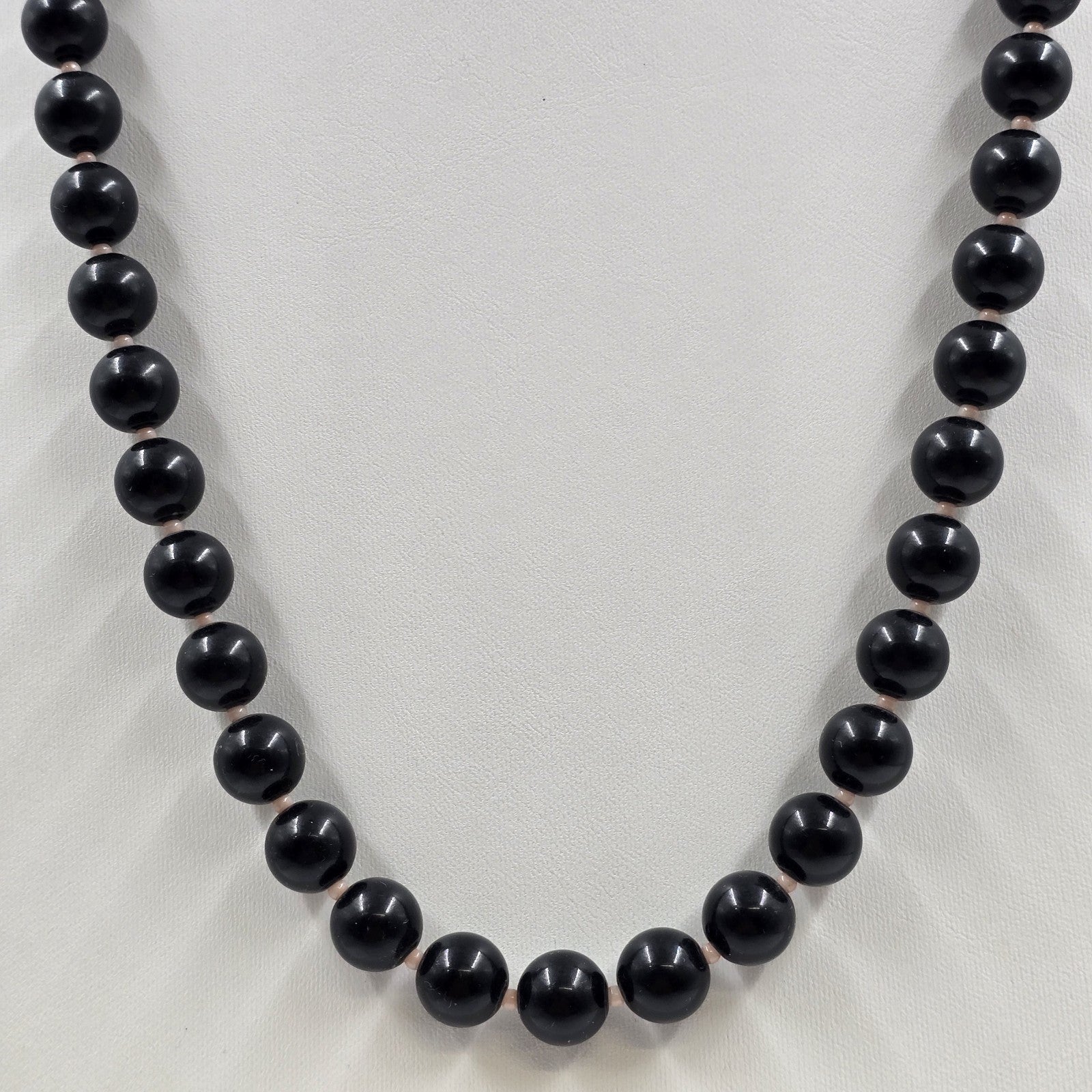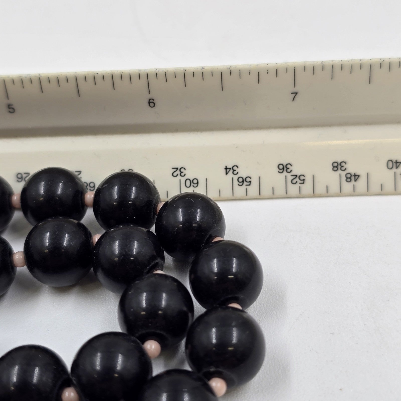 This vintage necklace features round black acrylic beads accented by delicate pale pink bead spacers, creating a timeless and elegant design. The necklace is secured with a gold-tone spring ring closure and has an approximate length of 14.5 inches, making it a perfect accessory for any occasion. Ideal for vintage jewelry enthusiasts or those looking to add a classic touch to their collection.