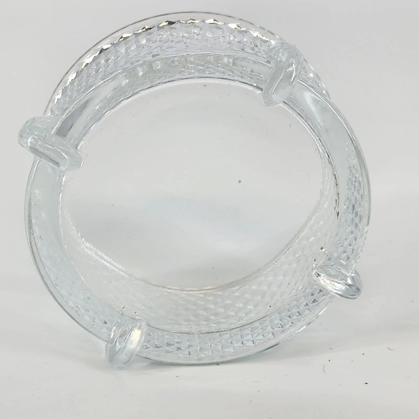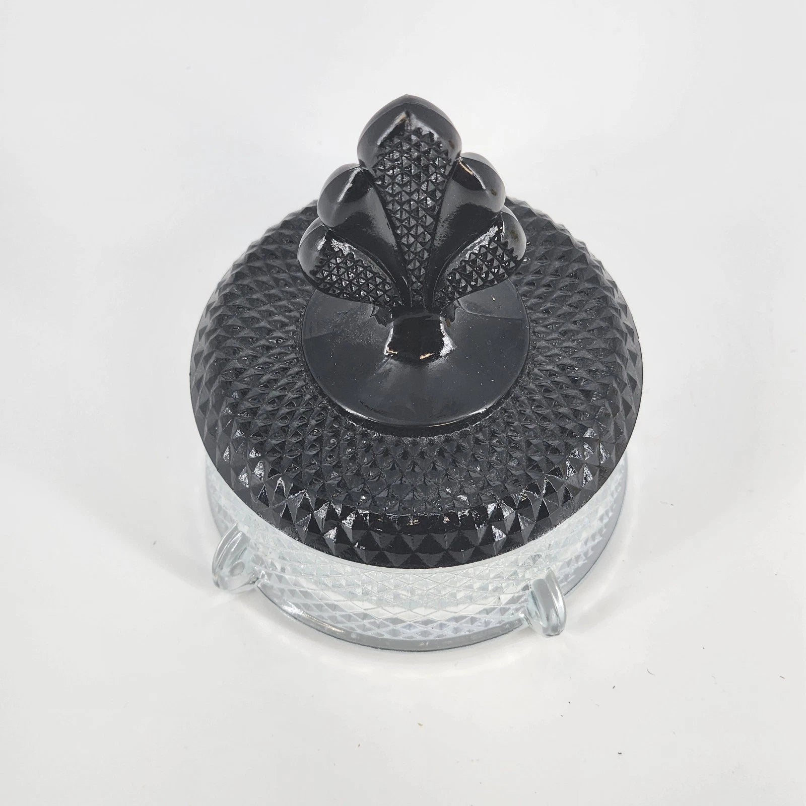 Step back into the glamour of the 1930s with this exquisite New Martinsville "Geneva" puff box. A stunning example of Art Deco design, this vanity jar features a clear crystal base and a striking jet-black glass lid topped with an ornate plume (or feather) finial. Both pieces are deeply molded with the "Brilliant Diamond" pattern, which catches the light beautifully from every angle. Whether used for powder, trinkets, or as a sophisticated display piece on a vintage dressing table, this dual-tone glass jar is a testament to the elegant craftsmanship of the Depression-glass era.