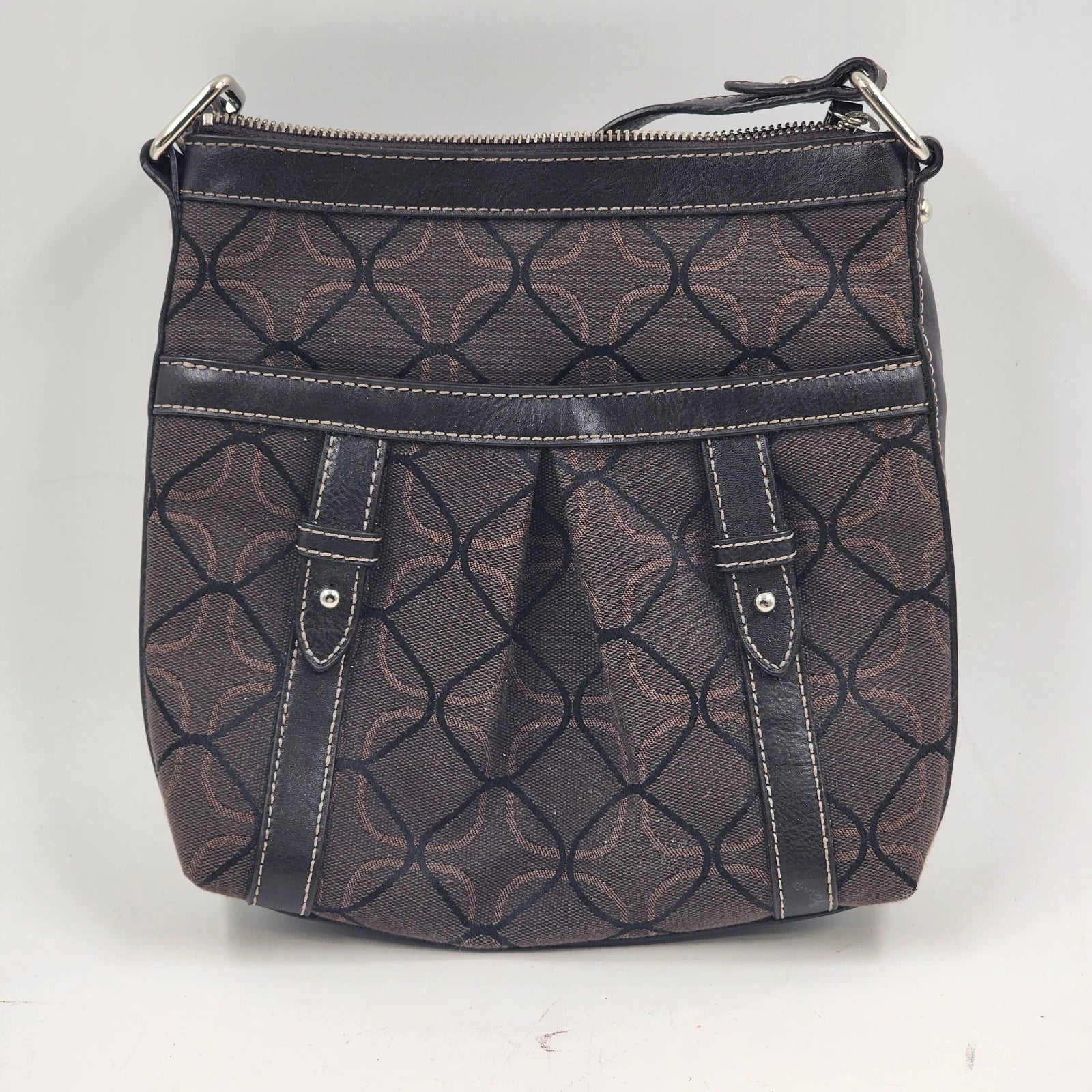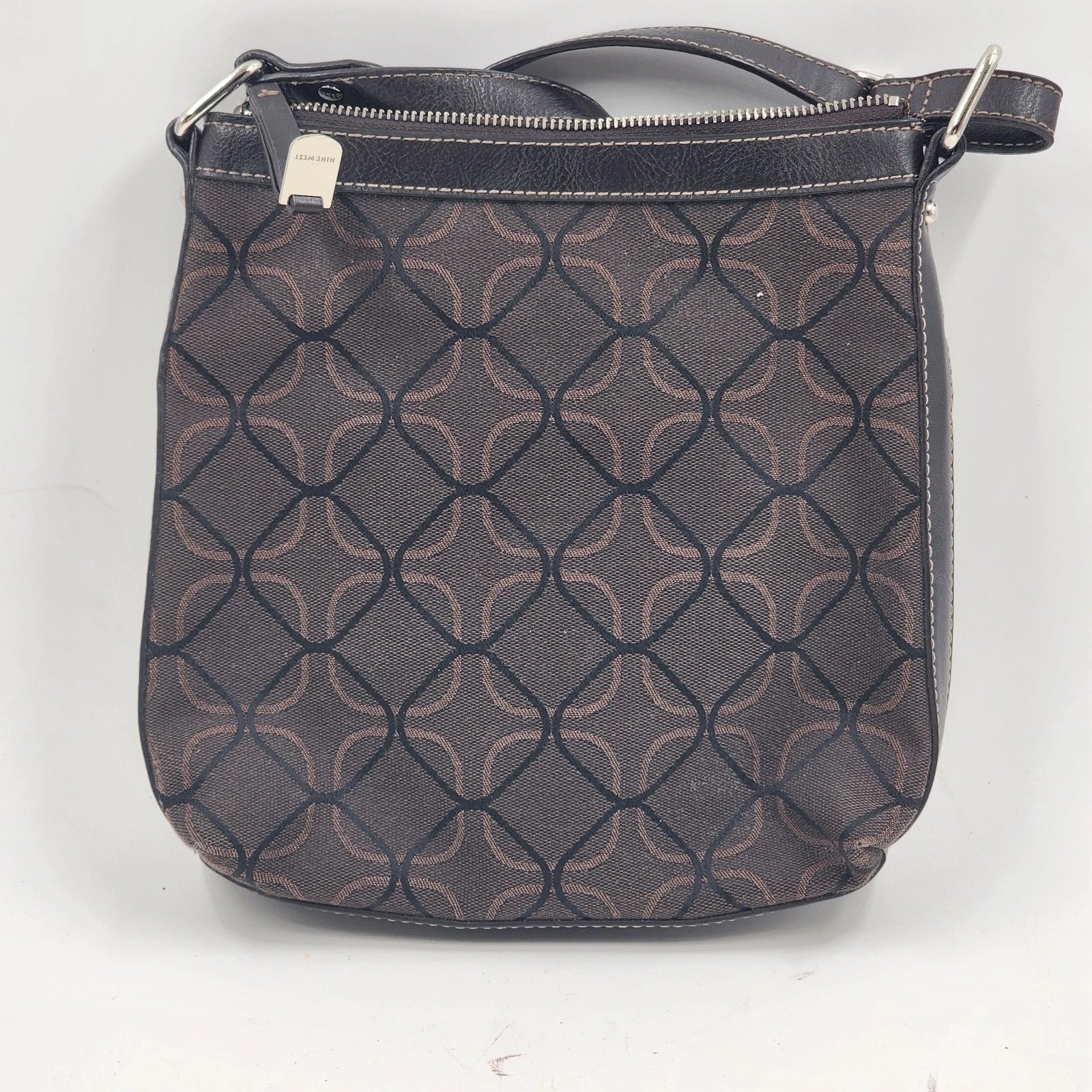 Elevate your everyday look with this classic Nine West Handbag. Featuring the iconic Nine West monogram signature print in a rich chocolate brown, this purse is the perfect neutral accessory for any season.
