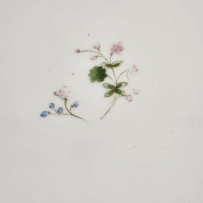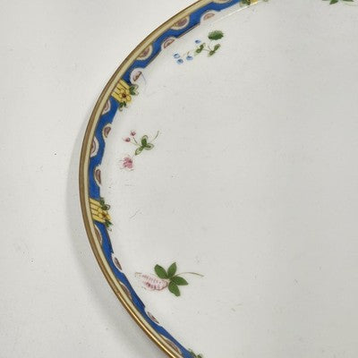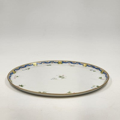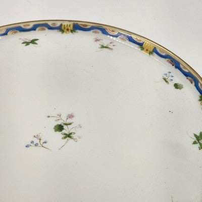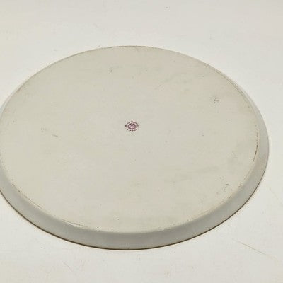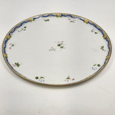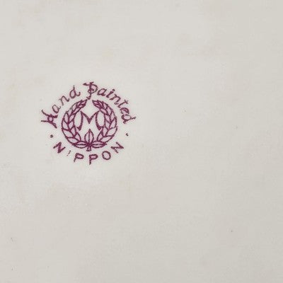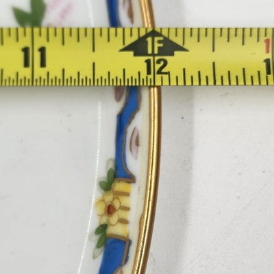 This beautiful 12" vintage serving plate by Nippon Morimura features delicate hand-painted flowers with a soft blue and yellow edge, an exquisite example of early Japanese porcelain craftsmanship. A perfect display piece or addition to fine china collections.