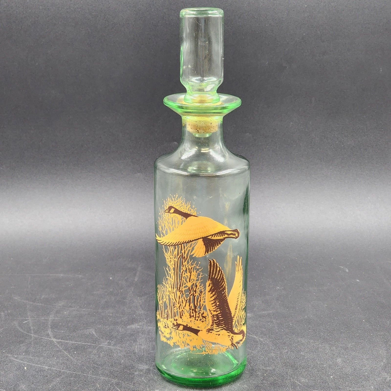 Vintage Old Fitzgerald Whiskey Decanter featuring a beautiful flying geese wildlife design. This mid-century modern (MCM) glass bottle is empty and includes its original stopper, which appears to be stuck in place. Perfect for collectors or as a display piece in a vintage bar or home décor setting.