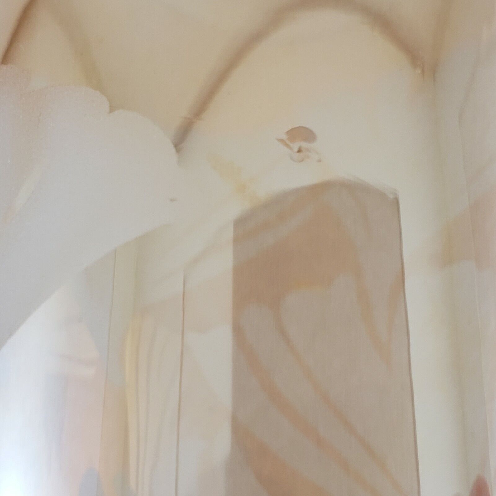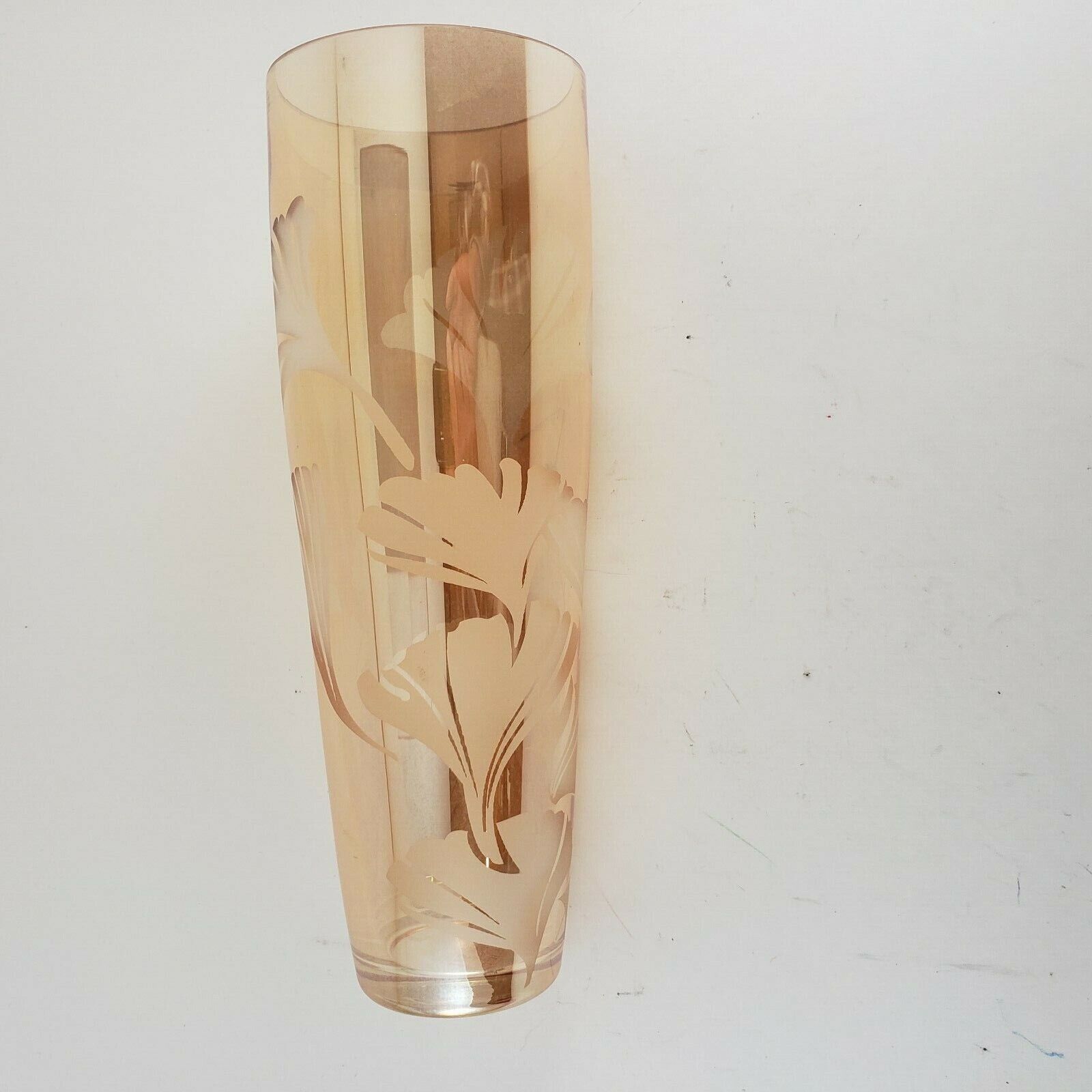 This stunning vintage peach lustre vase shimmers with an iridescent orange-gold finish that glows beautifully in natural and artificial light. Hand-blown and etched with an elegant ginkgo leaf design, this tall vase is both decorative and functional. Its rich color and unique pattern make it a striking centerpiece for any room.
