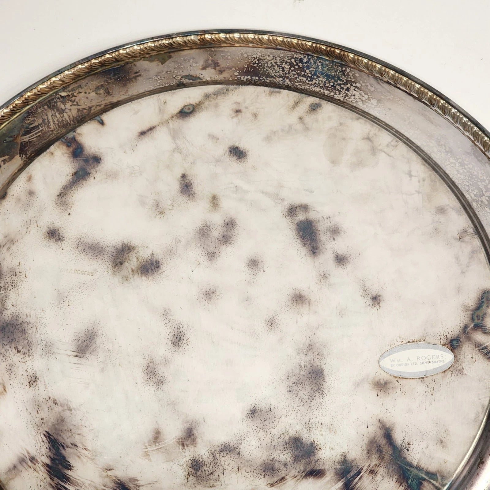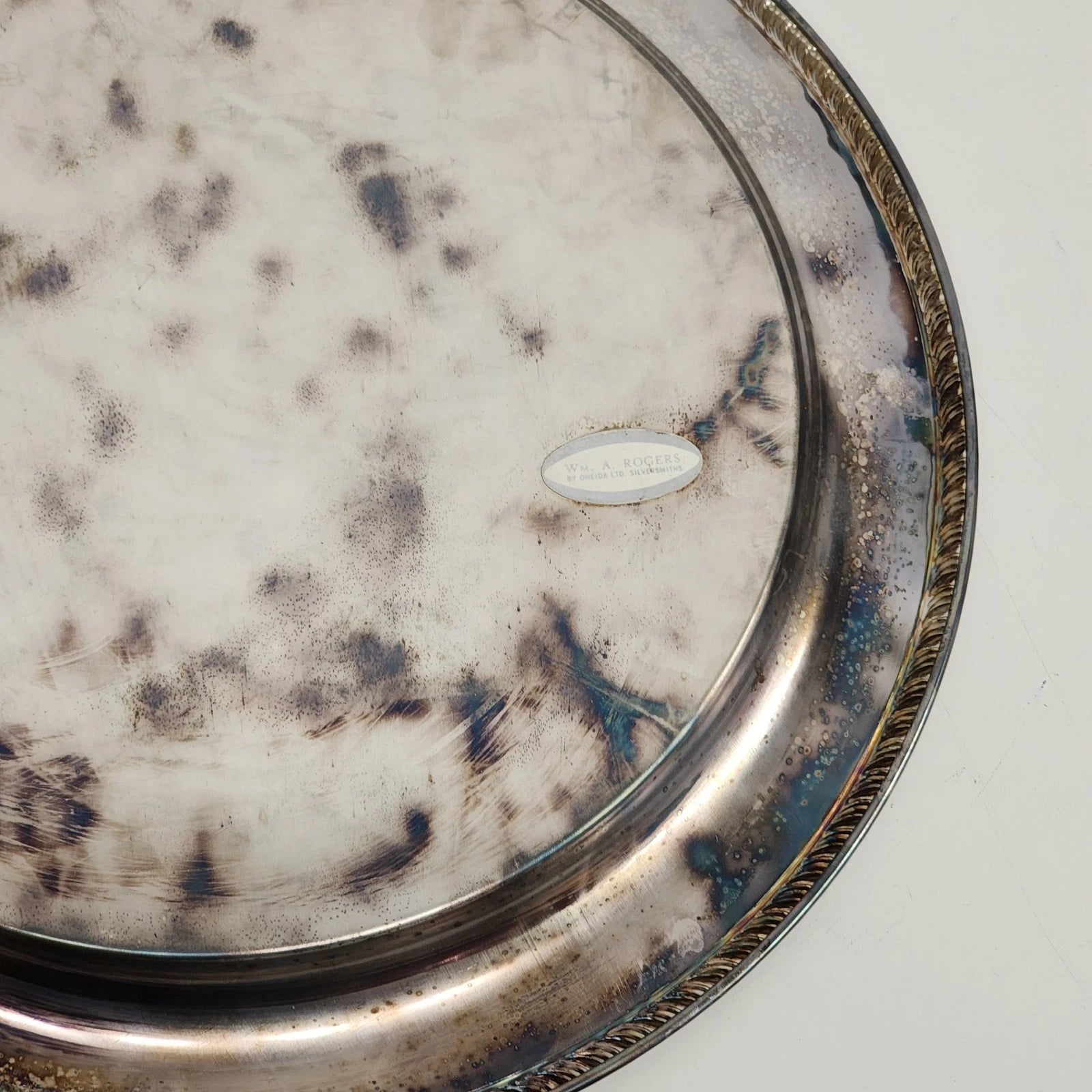 Elegant vintage Wm A Rogers silver-plated serving tray featuring a pierced gadroon rim design. This round tray showcases timeless craftsmanship and classic detailing, perfect for serving or decorative display. It has a natural patina from age that enhances its vintage charm.