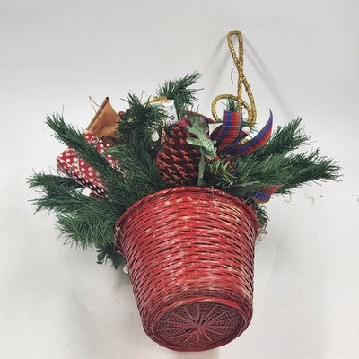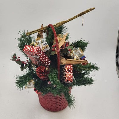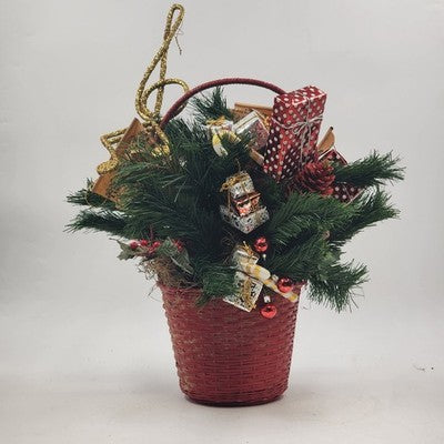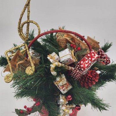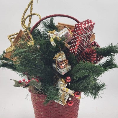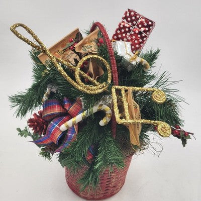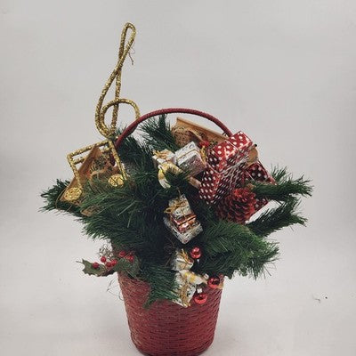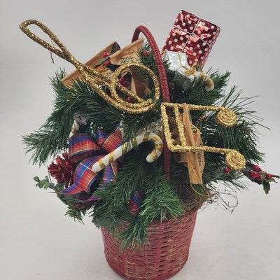 Design: Pine Basket with Artificial Pine Needles, Pinecones, Greenery, Gift & Music Symbol Accents