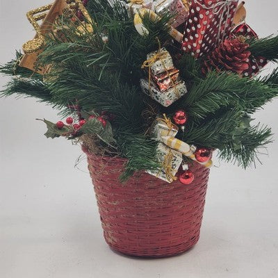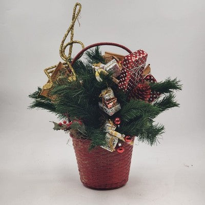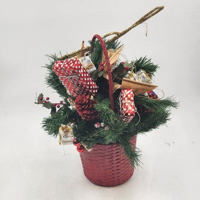 Bring festive charm to your holiday décor with this pine basket Christmas centerpiece. Featuring artificial pine needles, pinecones, greenery, gift accents, and music symbols, this arrangement makes a perfect seasonal display for your table, mantle, or entryway.