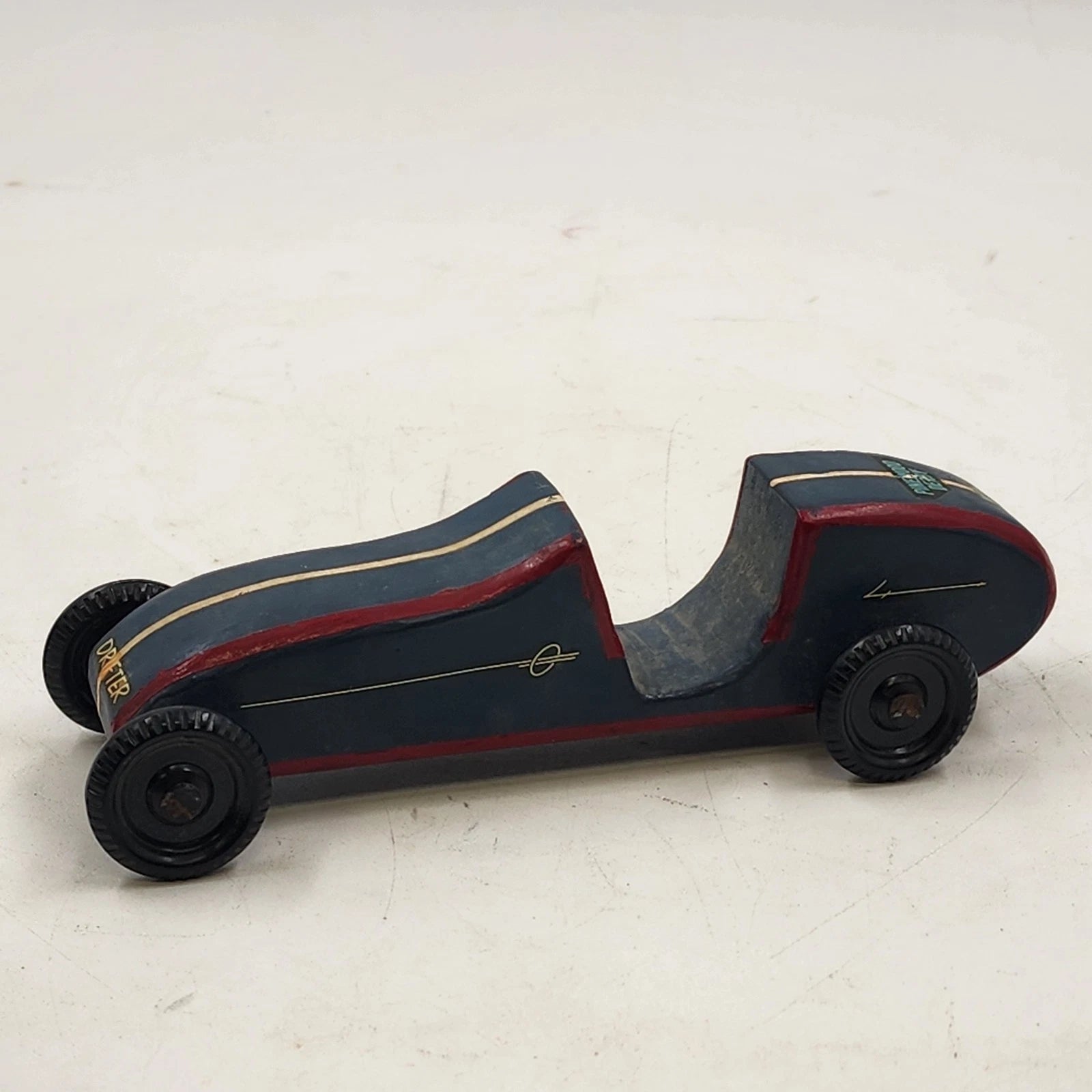This car is a wonderful example of early Derby construction, featuring hard plastic wheels on metal rod axles driven through wooden dowels. Unlike modern kits, this car was hand-shaped and hand-painted, giving it a unique "folk art" character that looks exceptional on display.