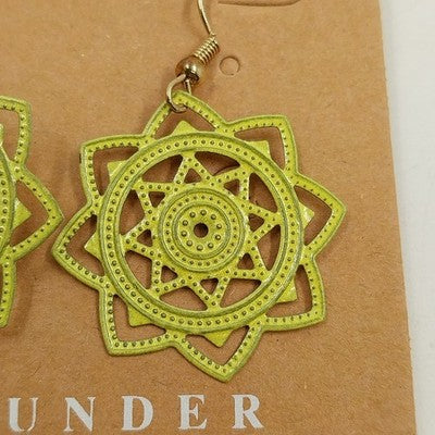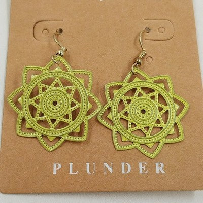 Charming Plunder earrings featuring a pale yellow geometric star-shaped filigree design. Lightweight and stylish, perfect for a boho-inspired look. Comes on the original Plunder display card with hook closure.