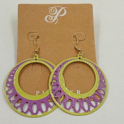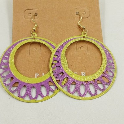 Chic Plunder "Sally" earrings featuring a round filigree design in light lime green and light purple tones. Lightweight and stylish, these earrings add a fresh spring-inspired boho flair to your jewelry collection. Designed with hook closure for comfortable wear.